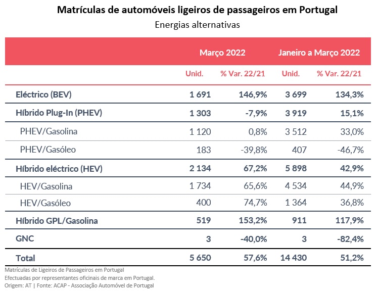 Um dos grandes responsáveis pelo crescimento foi o mercado de automóveis alimentados a energias alternativas, com o primeiro trimestre a demonstrar um aumento acentuado de 51,2% nos modelos ligeiros de passageiros com outros tipos de motorizações que não as unicamente a combustão. Em particular, verifica-se um aumento de 146,9%, no mês de março, nos veículos elétricos (BEV) em comparação com o mesmo mês de 2021. O aumento da oferta no mercado ajuda a que esta tendência comece a ser cada vez mais contundente.