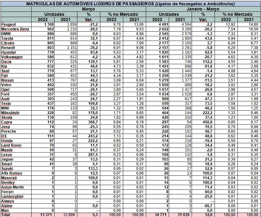 No aglomerado dos três primeiros meses, a Peugeot surge então como a líder destacada, com 4491 unidades matriculadas, caindo 2,2% nas vendas (4594 em 2021), perdendo também quota de mercado por efeito de uma maior representatividade de outras marcas. A Mercedes-Benz é a segunda mais vendida, com 2622 matrículas, embora com uma prestação menos positiva ao perder -20,2% face ao mesmo período de 2021. Pouco atrás, dando continuidade a uma batalha entre marcas Premium, surge a BMW, com 2545 unidades matriculadas, perdendo apenas -1,3% face ao ano passado.