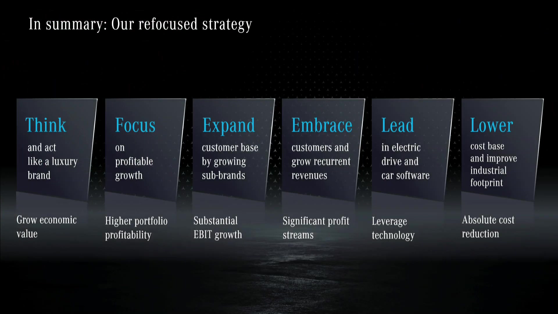 A primeira ideia lançada pelo líder da Mercedes-Benz passa pelo estabelecimento e cumprimento de seis pilares muito rigorosos para a estratégia da Mercedes-Benz nos próximos dez anos: pensar e agir como uma marca Premium, focar-se na rentabilidade e sustentabilidade das operações, aumentar a base de clientes através do crescimento das submarcas, ‘abraçar’ os clientes e aumentar as receitas com serviços recorrentes, ser líder nos VE e na criação de software e, por fim, baixar o custo de base e melhorar a pegada industrial.