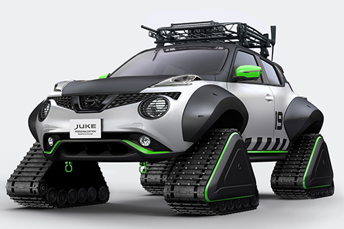 Este arrojado ‘monstro das neves’ será um dos muitos modelos especiais em exposição no evento japonês, destacando-se por diversas modificações técnicas para albergar o conjunto de lagartas (quatro), que permitem a este Juke ‘passear-se’ por locais repletos de gelo e neve.