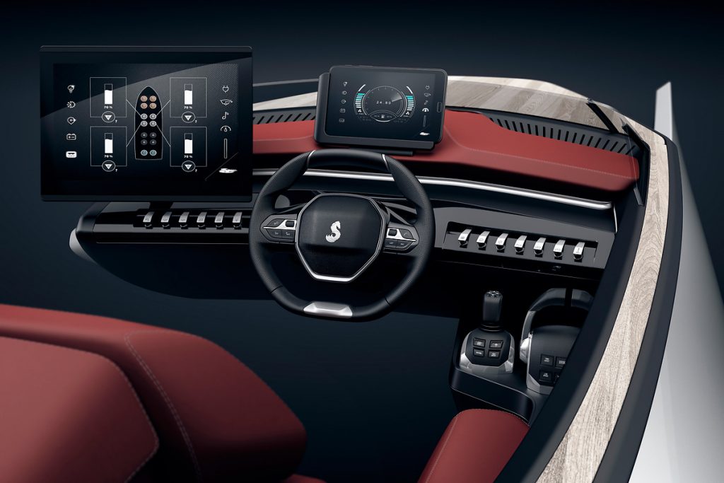 Do leque de elementos retirados dos automóveis da Peugeot constam o volante (de reduzidas dimensões), o ecrã tátil de 17 polegadas que exibe o interface ShipControl e que permite acesso imediato às funcionalidades eletrónicas do barco, um tablet amovível que permite exibir as principais informações de navegação no eixo de visão do piloto e os interruptores dispostos à esquerda e à direita do volante que permitem um acesso direto e permanente às funções principais.