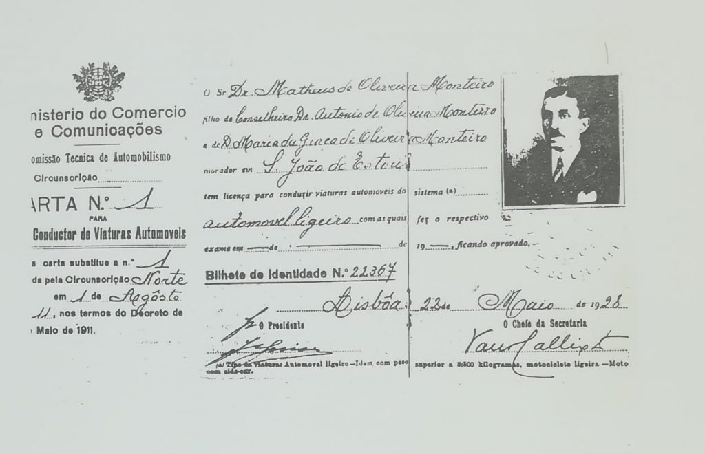 Método que hoje é universal para poder conduzir de forma legal é a carta de condução, cuja primeira unidade emitida (em cópia) está também em exposição na sede do ACP, ao abrigo da mesma exposição de mapas. Trata-se de um documento de 1928, atribuído pelo Ministério do Comércio e Comunicações e pela sua Comissão Técnica de Automobilismo ao “Sr. Dr. Matheus de Oliveira Monteiro”, morador em Sº. João do Estoril, dando-lhe assim a habilitação legal para conduzir um veículo automóvel ligeiro.