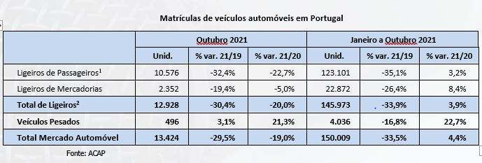 Assim, em outubro de 2021 foram matriculados 13.424 veículos automóveis novos em Portugal, ou seja, menos 29,5% do que no mesmo mês de 2019 e menos 19,0% quando comparado com outubro de 2020. No acumulado dos dez primeiros meses de 2021 foram colocados em circulação 150.009 novos veículos automóveis, o que representou uma diminuição de 33,5% relativamente a 2019, apesar da comparação com 2020 mostrar um aumento de 4,4%.