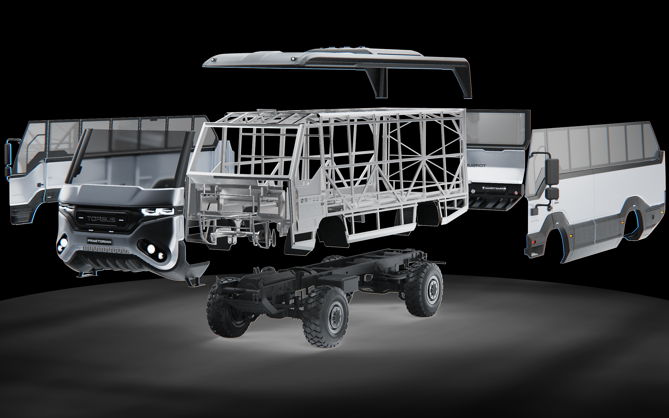 O chassis soldado do Praetorian conta com 780 componentes, incluindo 273 metros de elementos de aço para um total de 1182 kg e painéis de metal de elevada resistência que representam um total de 351 kg, demarcando-se por um processo de revestimento de três fases para máxima proteção contra corrosão, algo essencial atendendo a que o Torsus Praetorian está pensado para utilização nas condições mais extremas do mundo.