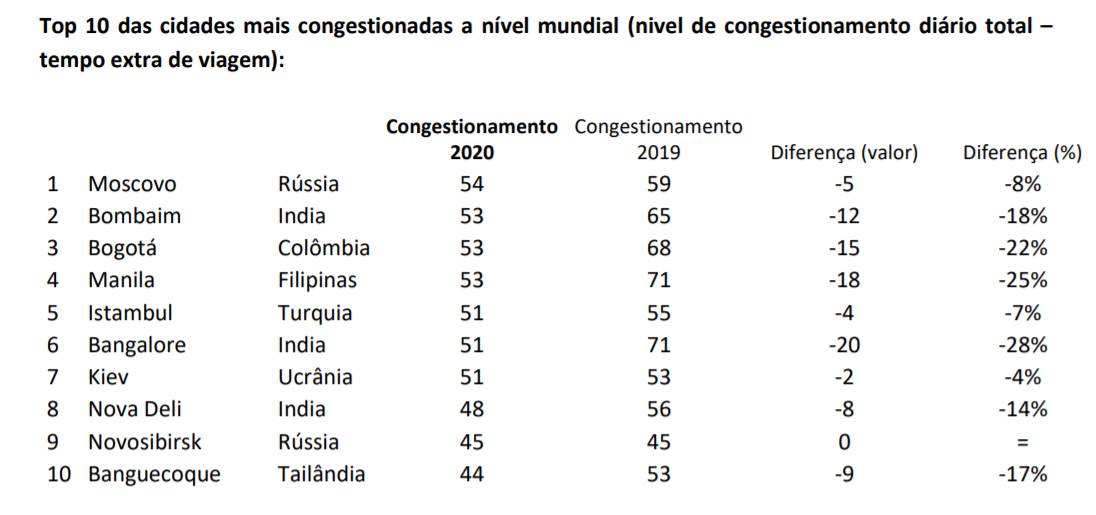 O ranking mundial não registou grandes mudanças em relação ao que foi verificado em 2019, embora tenham existido quedas significativas nos congestionamentos nas cidades da Europa, América e Ásia. Por exemplo, Bangalore (Índia), apesar de ser a cidade que mais reduziu o seu congestionamento no mundo (20%), continua no top 10 das cidades mais congestionadas a nível global, após atingir 51% de média durante 2020. Também se confirma a preponderância de cidades asiáticas e do leste europeu no ranking, como as urbes da Rússia, Ucrânia ou Turquia.
