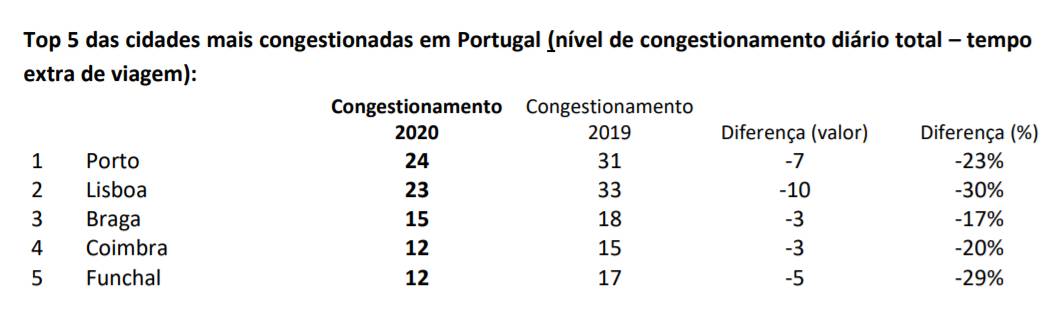 A análise do trânsito ao longo de 2020 demonstra que as cinco cidades lusas observadas pelo TomTom Traffic Index registaram uma diminuição no congestionamento durante o ano. Porto e Lisboa ficam mesmo acima da média tendo as estradas mais congestionadas da Península Ibérica. O Porto subiu ao primeiro lugar das cidades portuguesas mais congestionadas de 2020, com níveis de congestionamento médios de 24%. Ainda assim, este valor representa uma quebra de -23% em relação a 2019 (31%). Já a capital registou a maior quebra: 30% (-10 pontos, de 33 para 23), descendo para a segunda posição no ranking português.