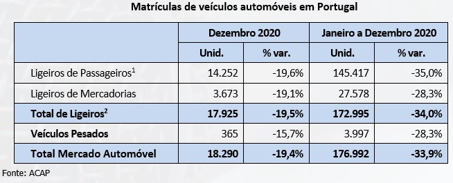 O mercado de ligeiros de mercadorias registou, em dezembro de 2020, uma descida de 19,1% face ao mês homólogo de 2019, com 3673 unidades matriculadas. No acumulado de 2020, este mercado atingiu 27.578 unidades, representando uma queda de 28,3% face ao período homólogo do ano anterior.Já o mercado de veículos pesados, o qual engloba os tipos de passageiros e de mercadorias, no último mês de 2020 verificou-se uma queda de 15,7% em relação ao mês homólogo do ano anterior, tendo sido comercializados 365 veículos desta categoria. No ano de 2020 as matrículas totalizaram 3997 unidades, o que representou uma queda do mercado de 28,3% relativamente ao período homólogo de 2019.