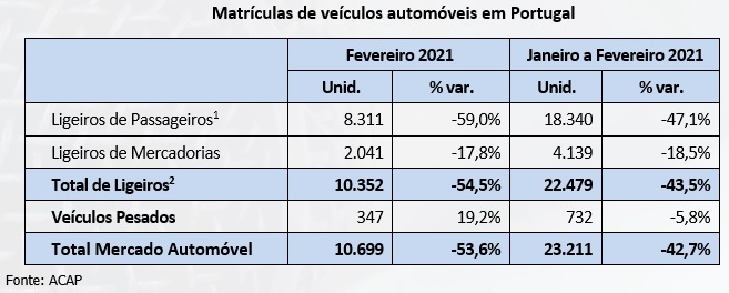De acordo com os dados da Associação de Comércio Automóvel de Portugal (ACAP), em fevereiro de 2021 foram matriculados em Portugal 8311 veículos ligeiros de passageiros, ou seja menos 59% do que em igual mês do ano anterior, num reflexo claro dos efeitos da pandemia.
