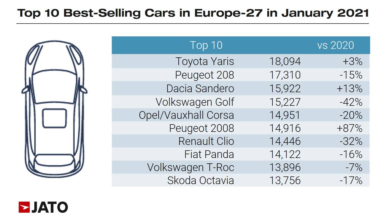 Quanto aos modelos mais vendidos em janeiro, o novo Toyota Yaris surpreende com a primeira posição, com 18.094 unidades matriculadas (+3%), superando o Peugeot 208, que ficou em segundo lugar, com 17.310 unidades (-15%). Na terceira posição ficou o novo Dacia Sandero, que consolida a sua posição de força no mercado europeu com 15.922 registos (+13%). O líder crónico Volkswagen Golf ficou apenas no quarto lugar, com 15.227 unidades (-42%).