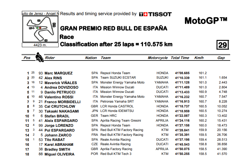 Marc Márquez concluiu as 25 voltas ao circuito Angel Nieto, em Jerez de la Frontera, em 41.08,685 minutos, deixando atrás de si os compatriotas Alex Rins (Suzuki), a 1,654 segundos e Maverick Viñales (Yamaha), a 2,443 segundos.