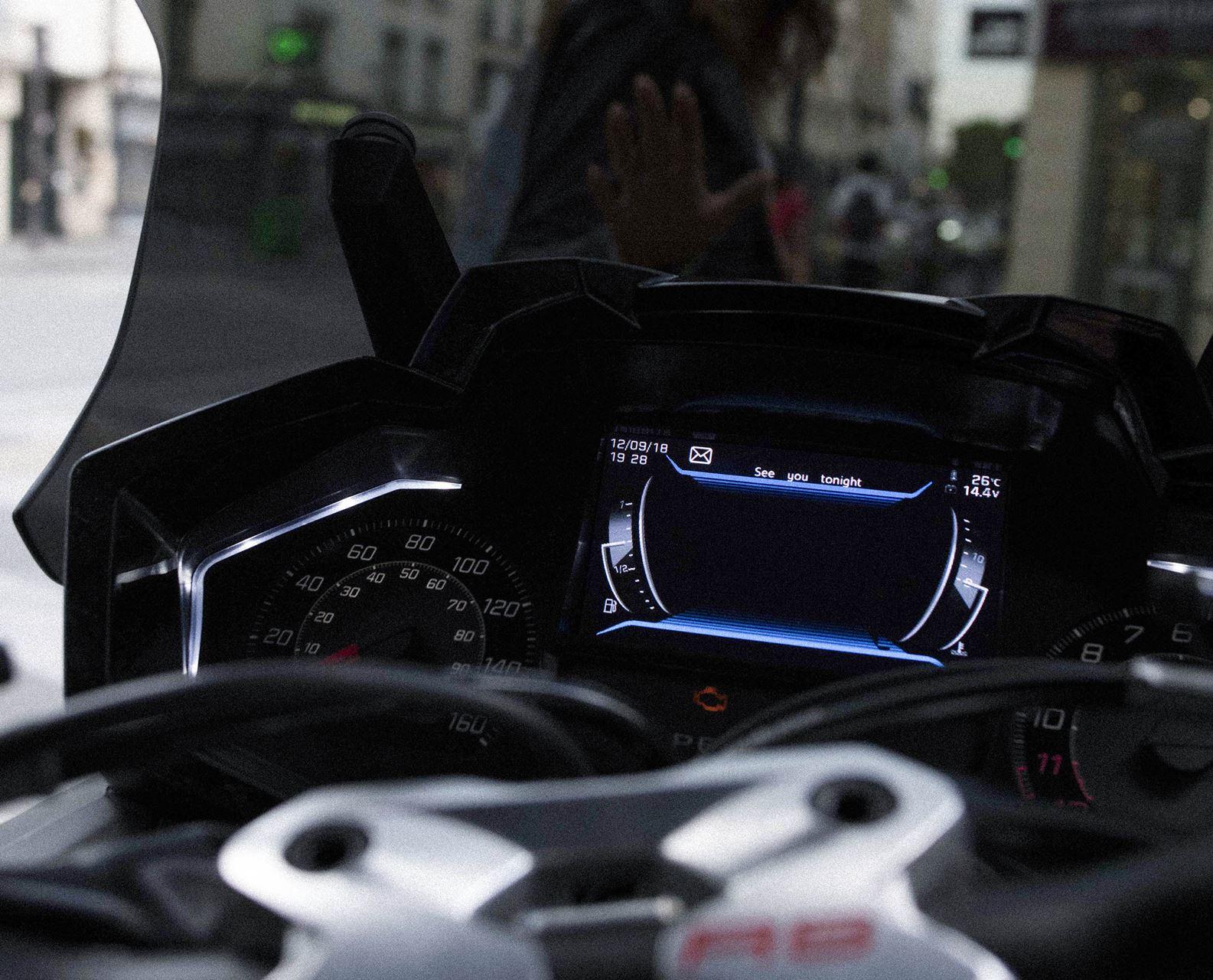 Conforto, potência, consumo… falta-nos falar sobre a tecnologia do painel de instrumentos que marca uma diferença significativa da concorrência. A Peugeot trouxe para as duas rodas a inspiração do sistema i-Cockpit que usa nos automóveis mais recentes, como os 308 e 5008. Temos à disposição um ecrã TFT a cores e muitas informações úteis à condução, de leitura legível também à noite, representando também segurança – por exemplo, o GPS integrado no sistema evita ter o smartphone em suportes no guiador ou, pior ainda, no bolso para consultar sempre que nos enganamos no trajeto. E por falar nisto, há uma porta USB para poder carregar a bateria do telemóvel durante a condução.