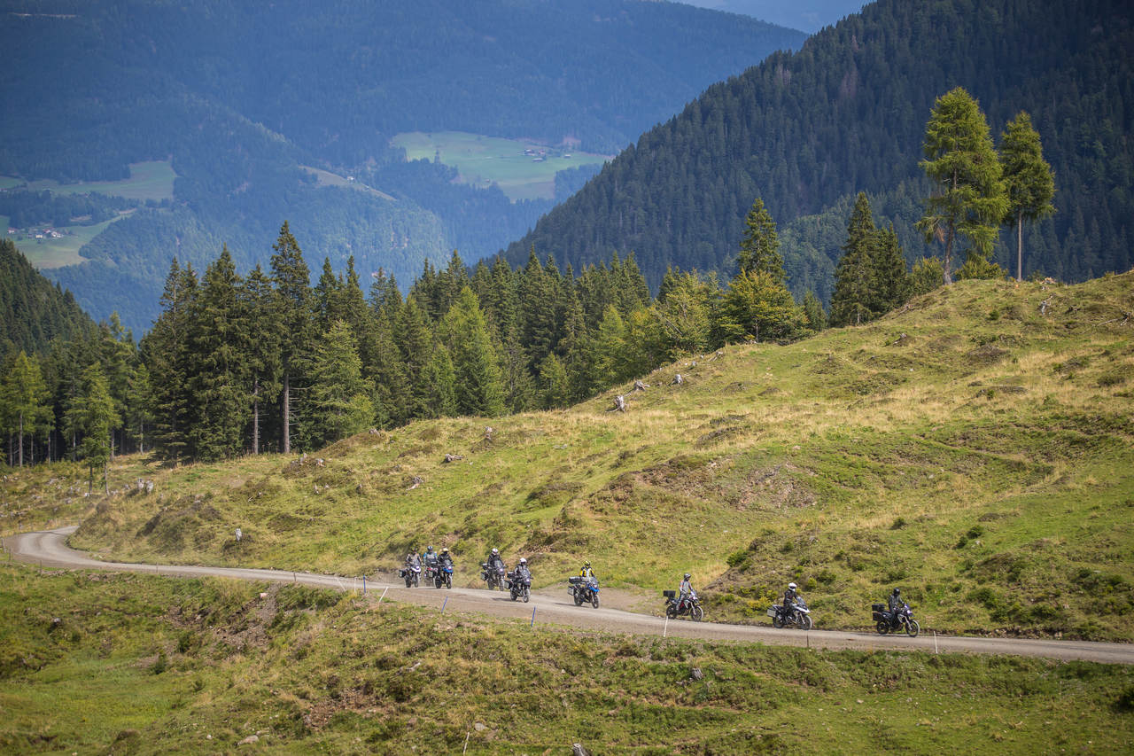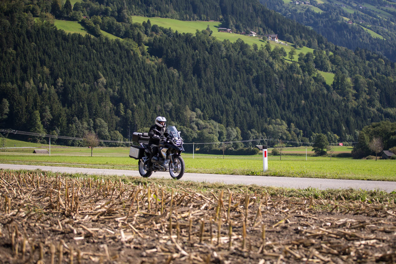 Às 8h30 da manhã já os nossos dois guias esperavam por nós para o arranque desta aventura, obviamente montados em duas BMW. Logo nos primeiros quilómetros é impossível conter a euforia de estar a desfrutar estradas alpinas com ótimo asfalto, curvas para todos os gostos e paisagens que pedem para abrir a viseira do capacete e inspirar profundamente o ar puro dos Alpes austríacos.
