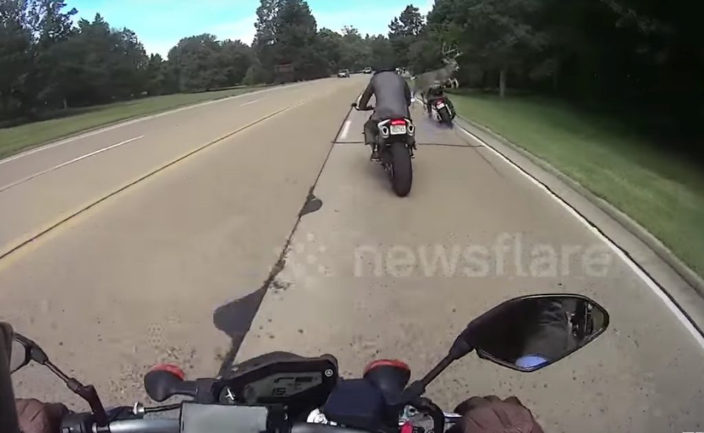 Os sinais de alerta para avisar que animais podem cruzar a estrada em qualquer momento, são para levar a sério, especialmente em parques naturais. Foi pelo menos isso que deve ter ficado a pensar um motard que seguia numa caravana de motos no Parque George Washington na Virginia (EUA), quando um enorme veado lhe passou um voo rasante, que não o atingiu, mas desequilibrou a sua moto, o suficiente para ela se despistar, felizmente sem consequências. Tanto o veado como o motociclista saíram ilesos deste encontro imediato, mas nenhum dos dois deve ter ganho para o susto.