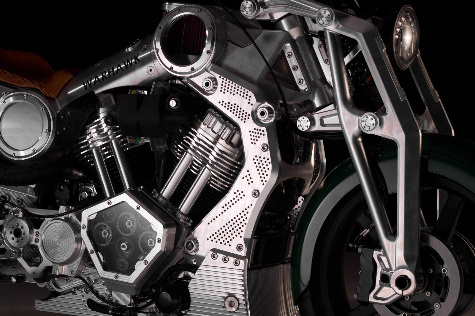 No coração da Warhawk está a configuração clássica para um motor americano do motos, o V-twin com árvore de cames lateral e duas válvulas por cilindro. Com dois cilindros de grandes dimensões, a cilindrada da Curtiss Warhawk é de 2163 cc, maior que muitos motores de automóvel, aqui gerando 150 cv, mais que suficiente para uma moto deste tipo, podendo acelerar até aos 265 km/h.