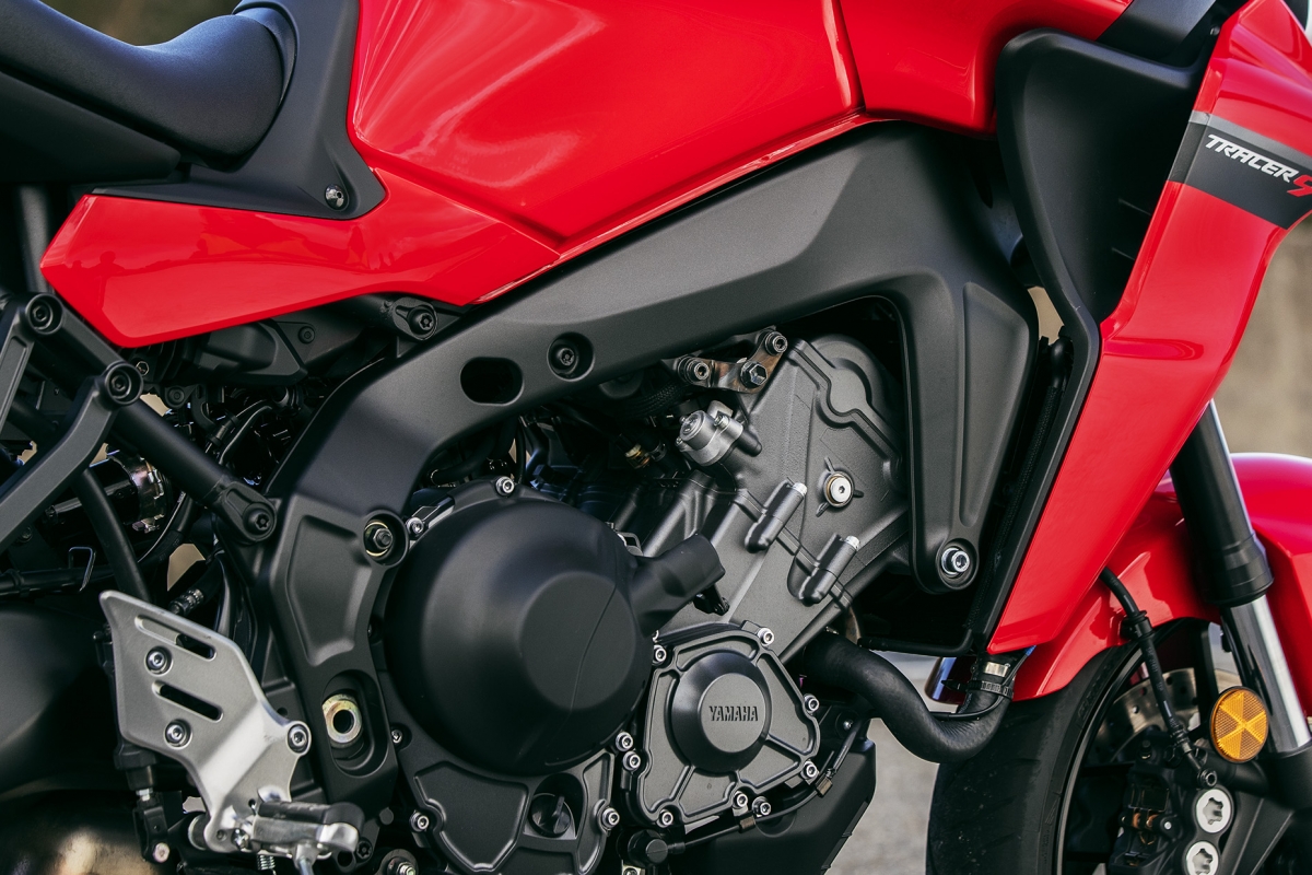 Em andamento, o som da Tracer 9 mantém a característica nota de escape, mas é agora mais pronunciado o som da admissão, a 1ª e a 2ª velocidades estão mais longas e o motor apresenta muita disponibilidade logo desde as baixas rotações. Mas, revela uma flexibilidade notável quando se sente tão à vontade a cruzar vias rápidas e estradas nacionais a ritmo elevado, como a circular no trânsito lento da cidade. Ambos os modelos partilham motor, quadro, travagem e a maioria da eletrónica, como é o caso dos quatro modos de condução que vai desde o 1, mais agressivo, até ao 4 em que a potência é reduzida. E ainda o “cérebro” que controla as funções que ajudam a manter a segurança: controlo de tração, controlo de escorregadelas laterais, controlo de levantamento da roda dianteira, ABS em curva e controlo de travagem combinado, que atua ao detetar pressão excessiva na manete ou pedal de travão, tudo personalizável.