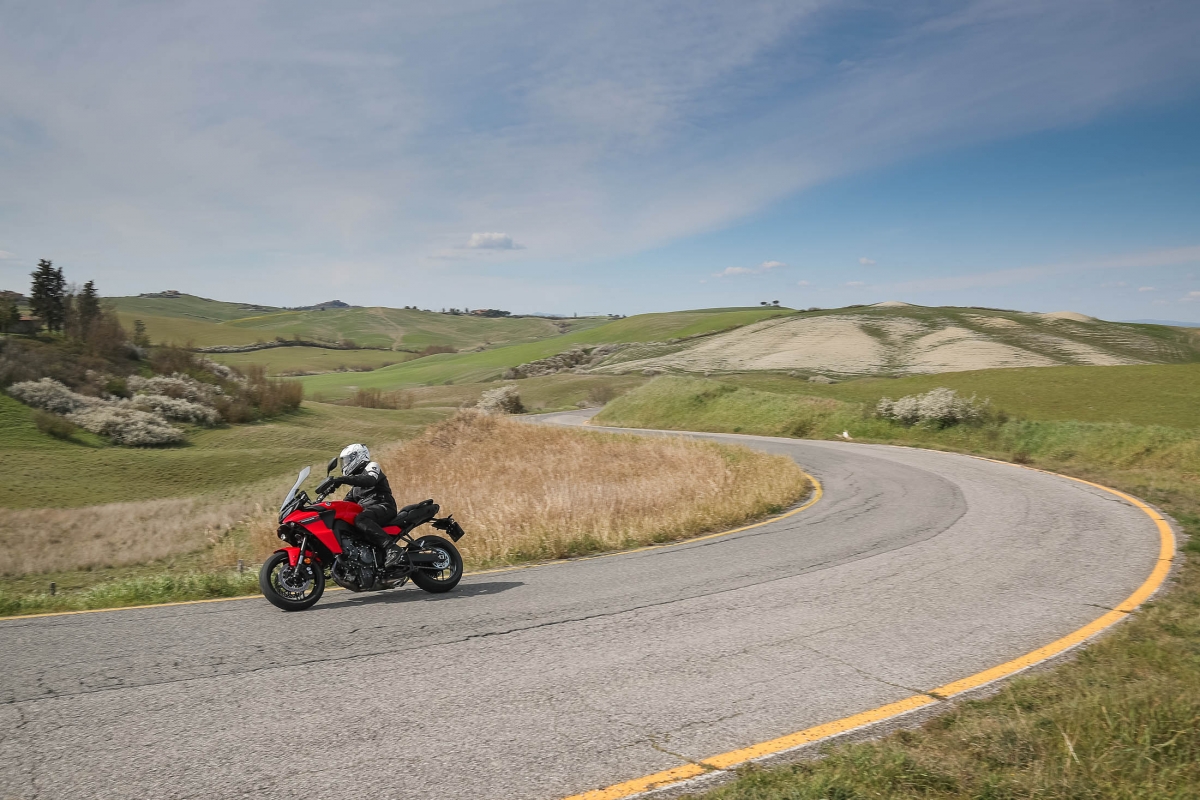 Em que diferem então as duas Tracer? A normal vem equipada com suspensões KYB totalmente ajustáveis, mas de forma manual, com uma afinação firme, têm um bom comportamento dinâmico sem serem desconfortáveis. Já na GT sofrem um upgrade para as de topo de gama semi-ativas em que apesar de terem dois modos de funcionamento, “sport” e “comfort”, a sua afinação privilegia sempre mais uma condução descontraída do que desportiva. A versão GT vem ainda equipada com luzes em LED com função automática em curva, malas laterais, punhos aquecidos (em 10 níveis) e sistema de mudanças sem embraiagem “quick shifter” bidirecional. Durante a nossa experiência com as novas Tracer 9 foi difícil eleger uma como a preferida. A Toscânia é capaz de ter sido a culpada, pois, muitas vezes, só apetecia apreciar a paisagem, e para isso, sem dúvida que a escolha era a Tracer 9 GT. Para tudo o resto seria a Tracer 9.