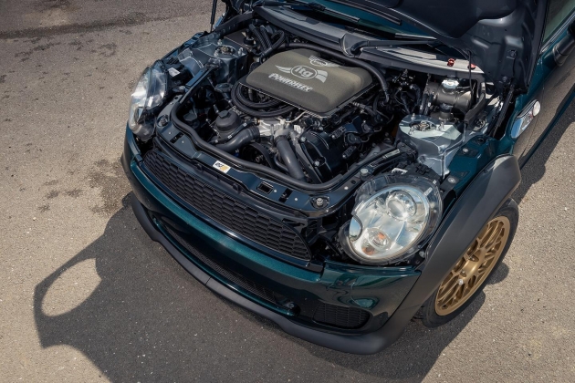 Depois de quatro longos anos de preparação, o modelo está finalmente pronto para a estreia dinâmica no Festival de Velocidade de Goodwood 2021. É um Mini Cooper S à vista desarmada, mas com um coração V8 do BMW M3. Debaixo do capot do icónico modelo britânico está nada menos do que o famoso bloco 4.0 V8 S65 da quinta geração M3 a debitar 420 CV às 8.300 rpm e 400 Nm de binário máximo às 3.900 rpm. Um poço de força e disponibilidade, que também conta com os préstimos da caixa DCT de sete velocidades original do M3.