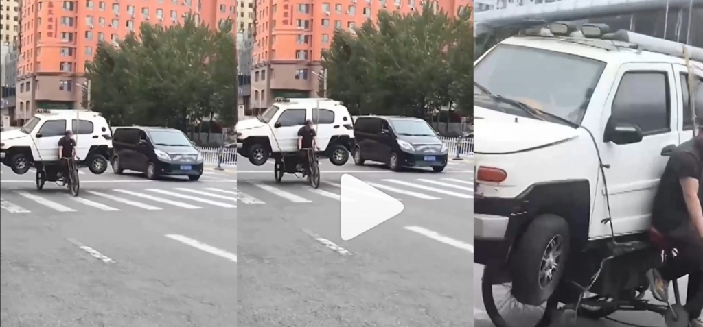 Ao que tudo indica, este curto vídeo – que não parece ser truque digital, até porque permite observar atentamente a cena desde vários ângulos distintos –, terá sido gravado na China e mostra um homem que trabalha habitualmente na recolha de ferro-velho a transportar na sua bicicleta o achado do dia: um automóvel!