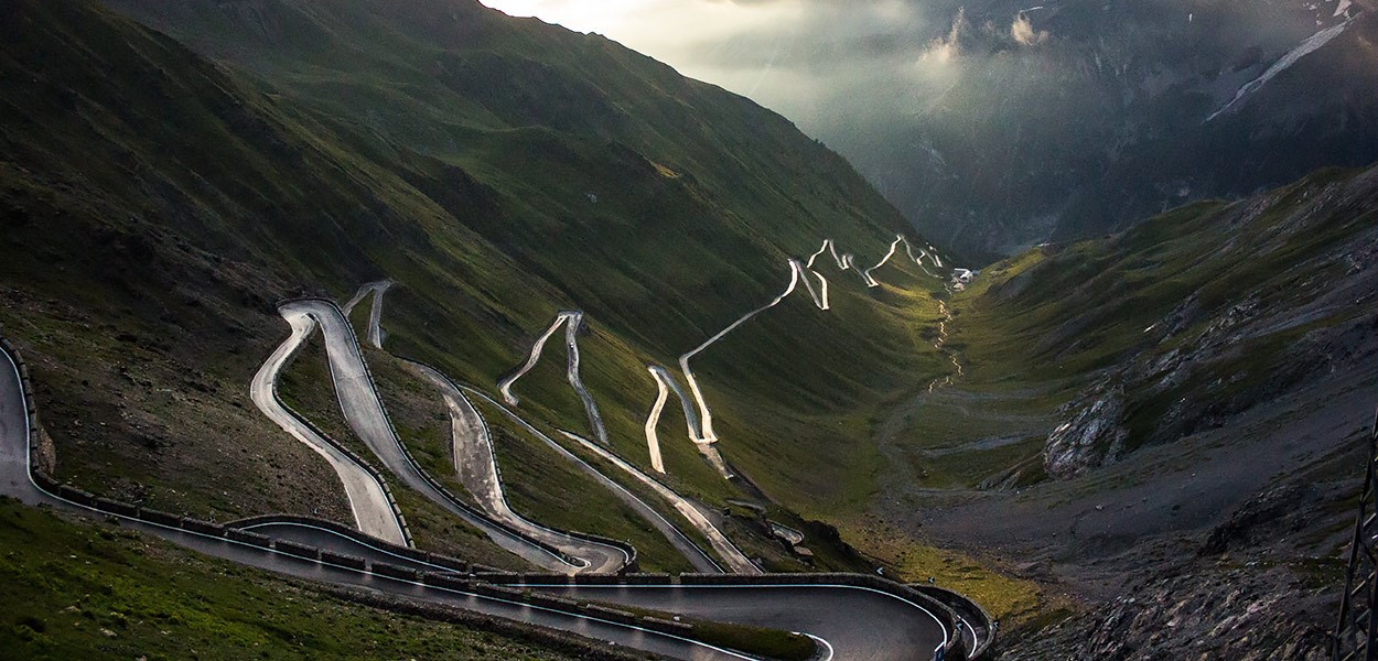 Stelvio Pass, Itália: Uma das estradas mais altas da Europa e também das mais famosas, a Stelvio Pass é conhecida pelas suas curvas em zigue-zague e vistas impressionantes dos Alpes. Escusado será dizer que é preciso ter mãos bem afinadas e suor bem frio.
