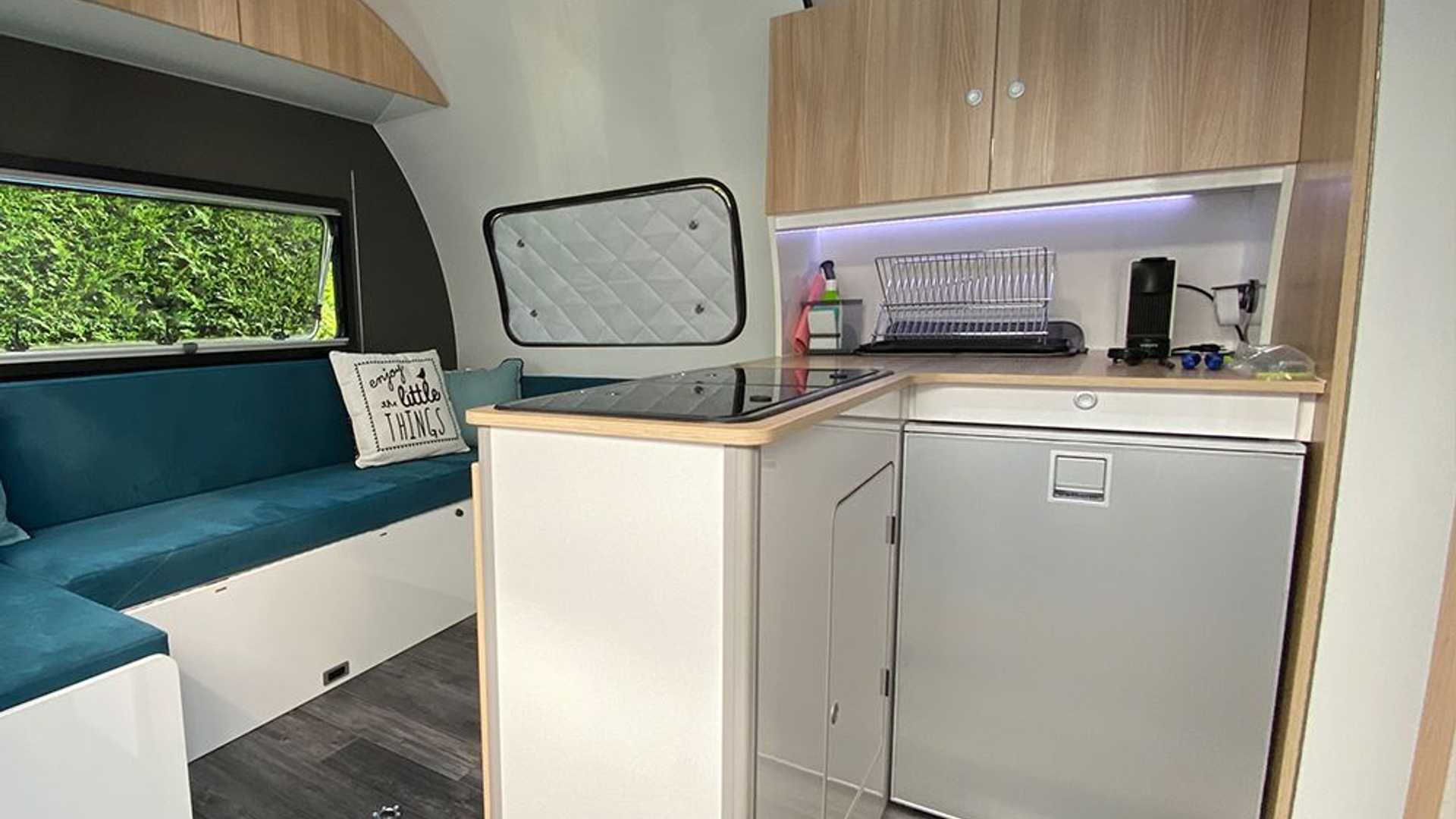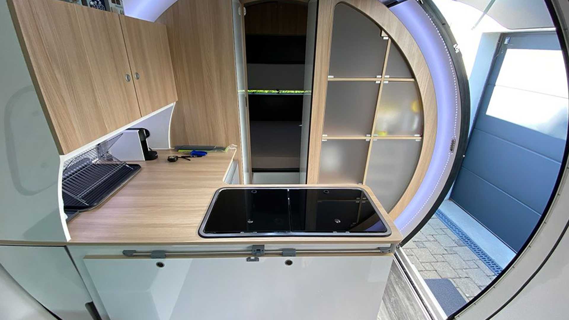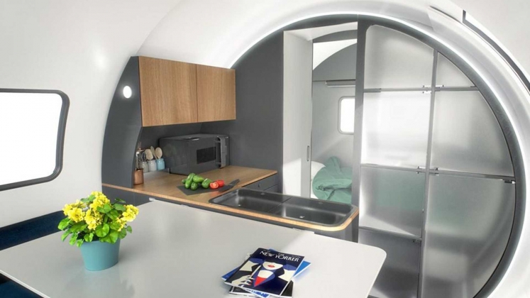 No módulo central fica a cozinha, equipada com micro-ondas, frigorífico e fogão, nos outros dois módulos ficam o dormitório e a casa de banho com duche e armazenamento para 19 litros de água.