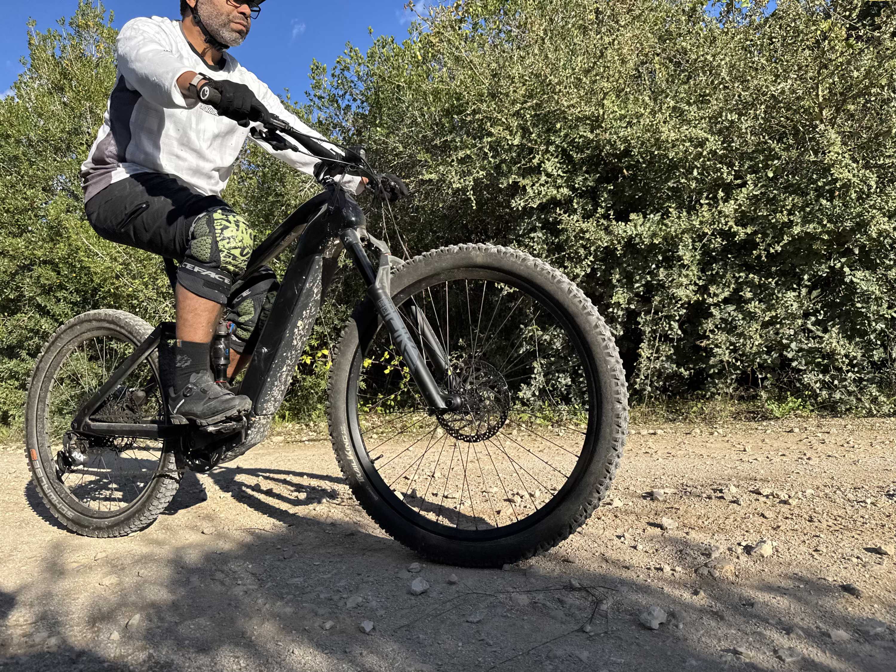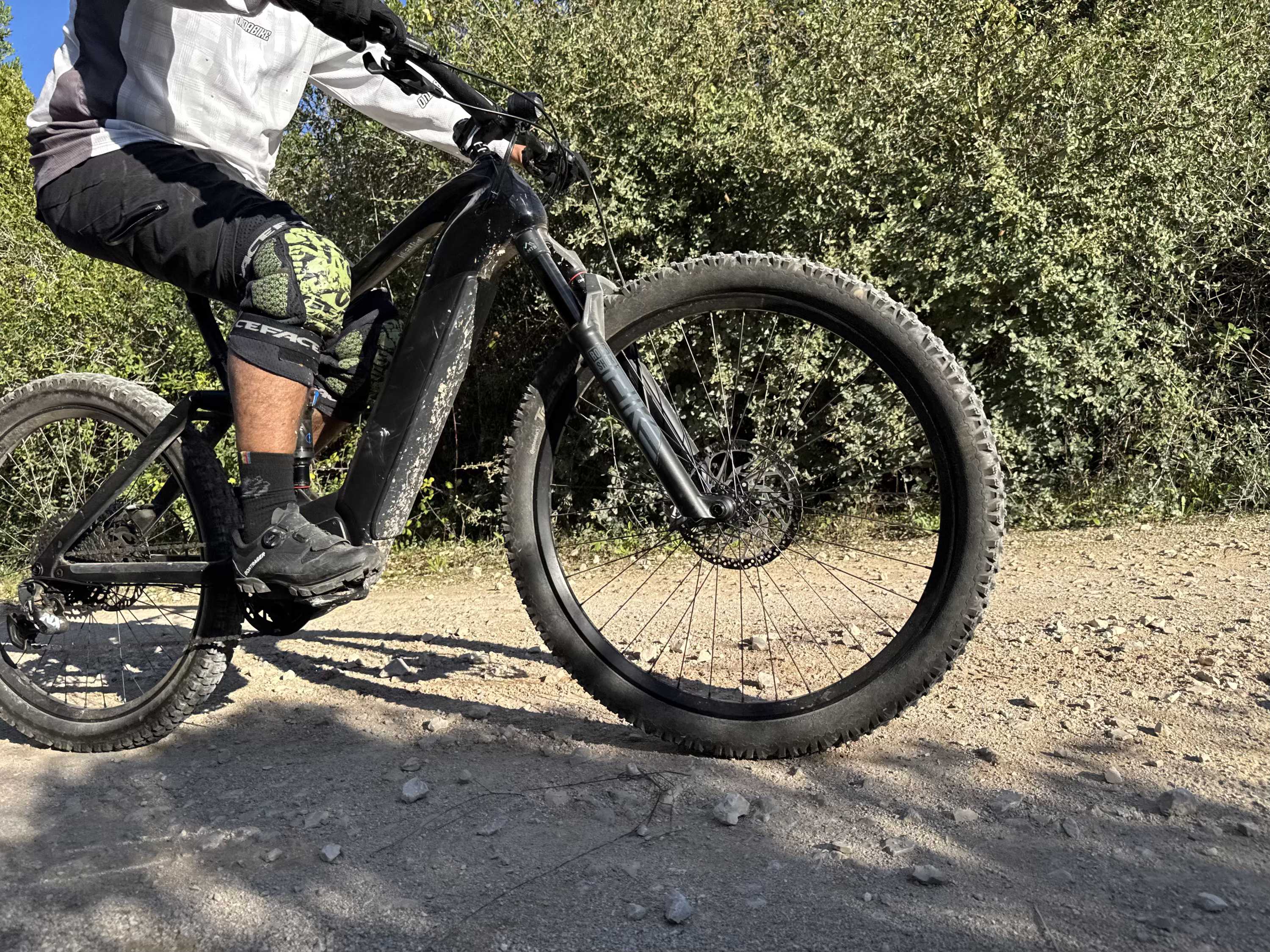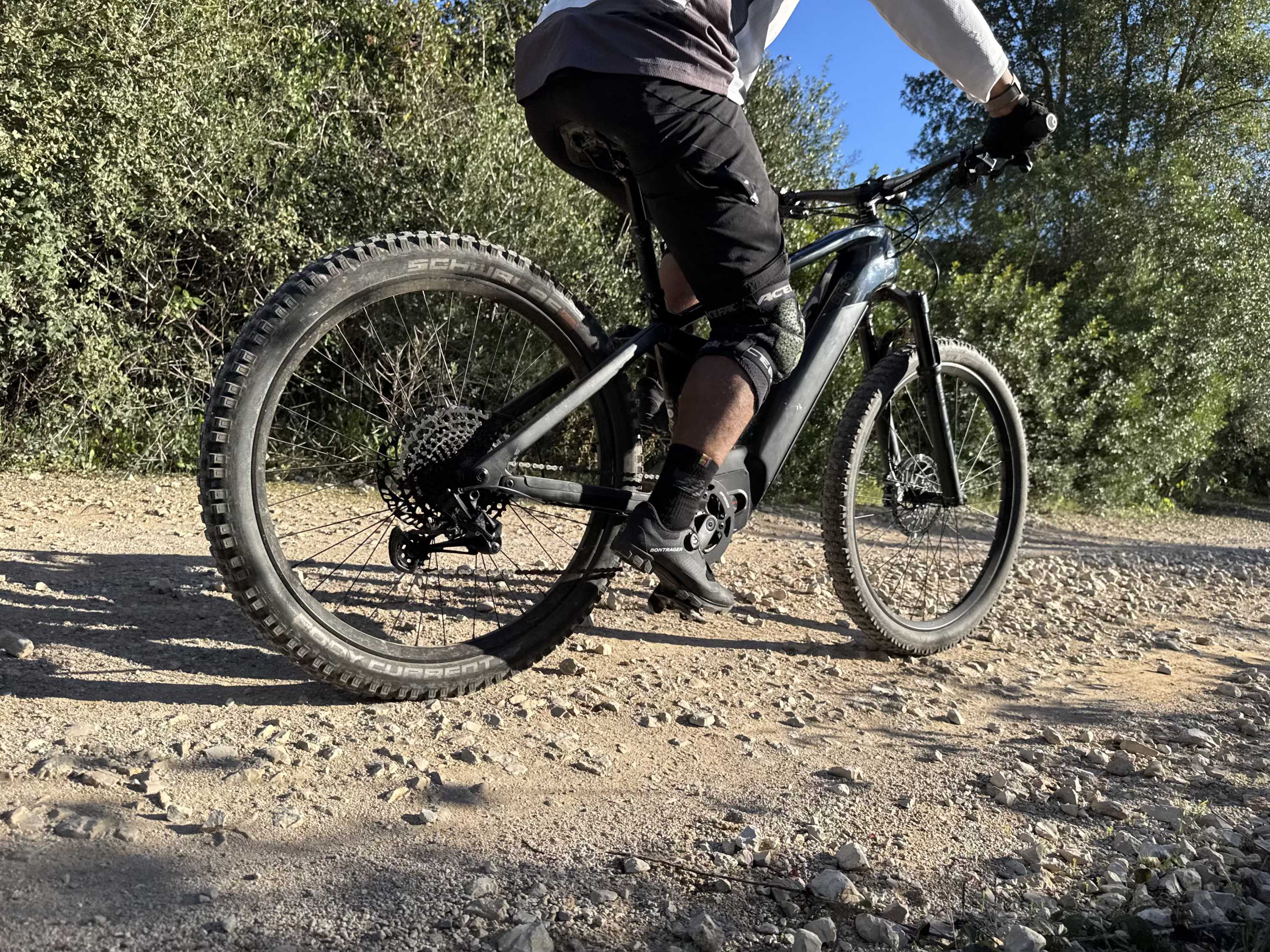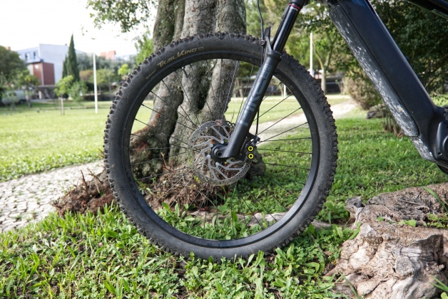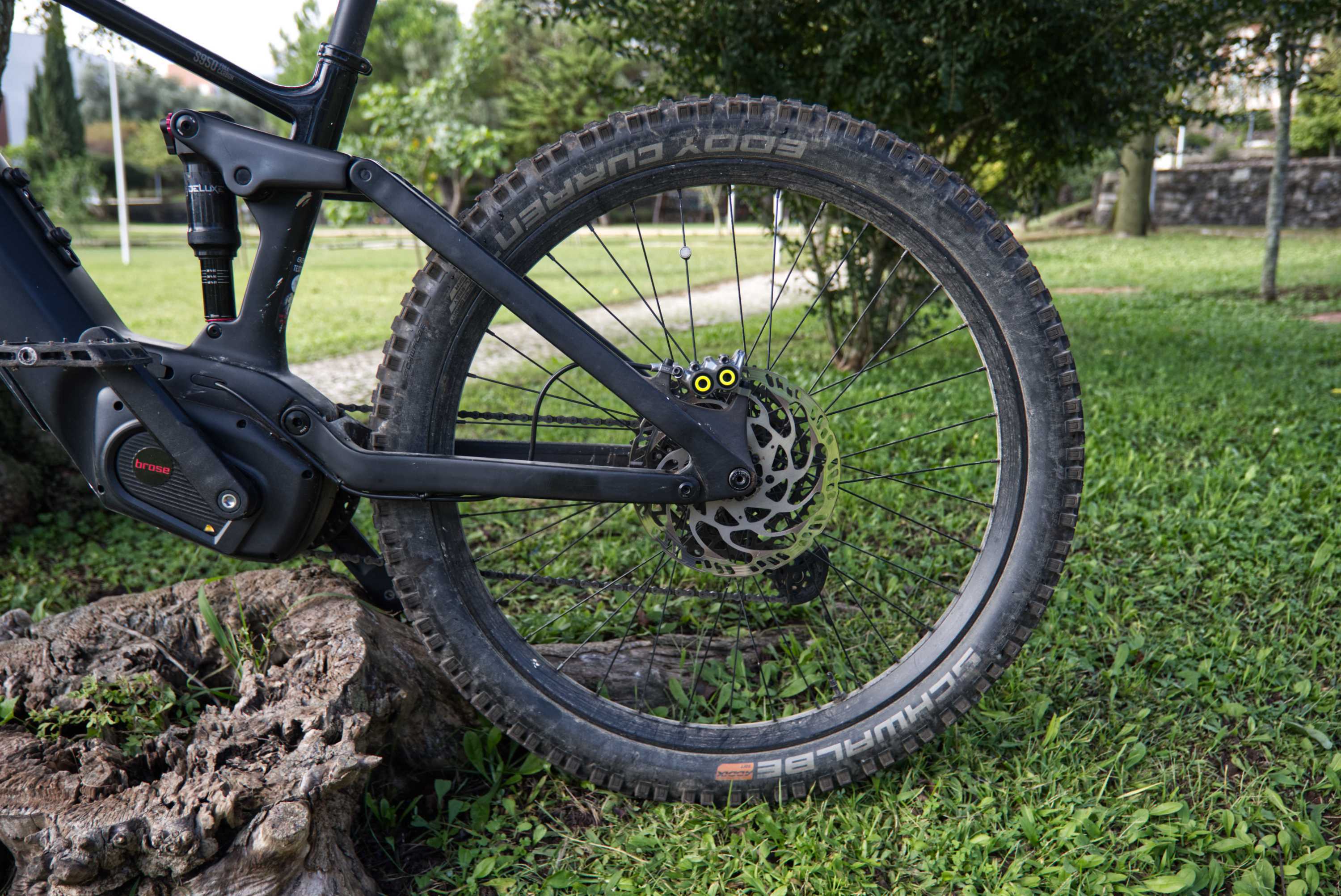 A marca optou pela solução “Mullet” com tamanhos de rodas diferentes sendo 29 na frente e 27,5 atrás com pneus Schwalbe Eddy Current (Tubeless Ready), que demonstraram excelente tração mesmo em piso solto. A potente travagem está a cargo dos Magura Hydraulic MT5 com discos de 203 mm nas duas rodas, e mostrou uma consistência muito boa, mesmo depois de ser castigada em descidas longas.