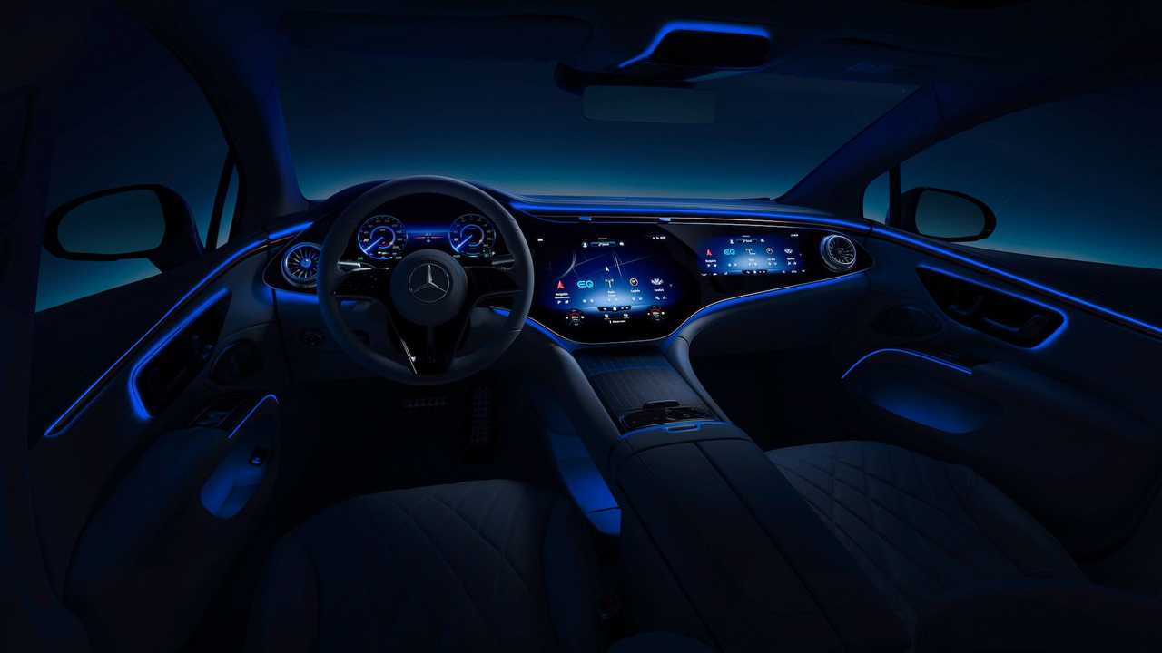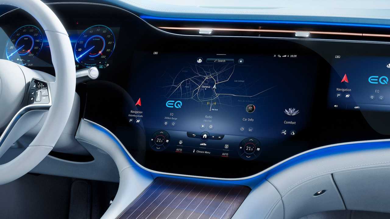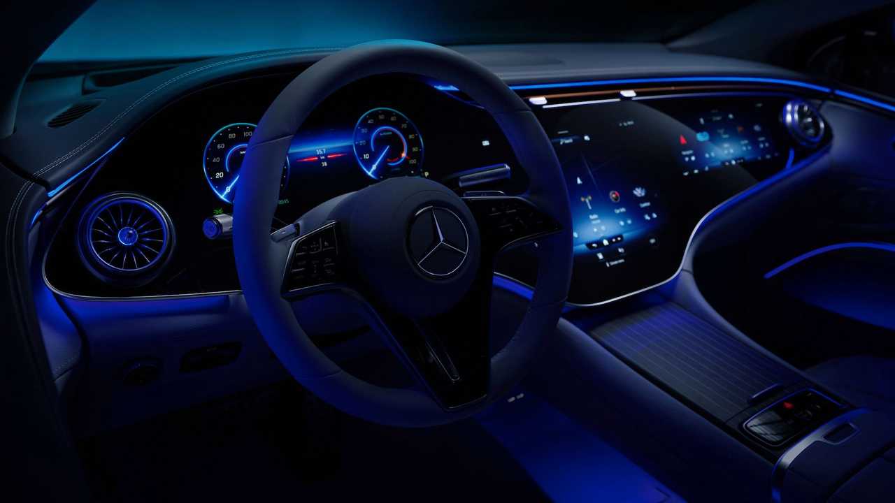 No total, o MBUX Hyperscreen mede 141 centímetros de ponta a ponta, com uma área utilizável pelos passageiros de 2.432,11 cm2. É apenas um dos elementos de destaque no interior do automóvel que se posiciona no mercado como uma espécie de Classe S dos elétricos.