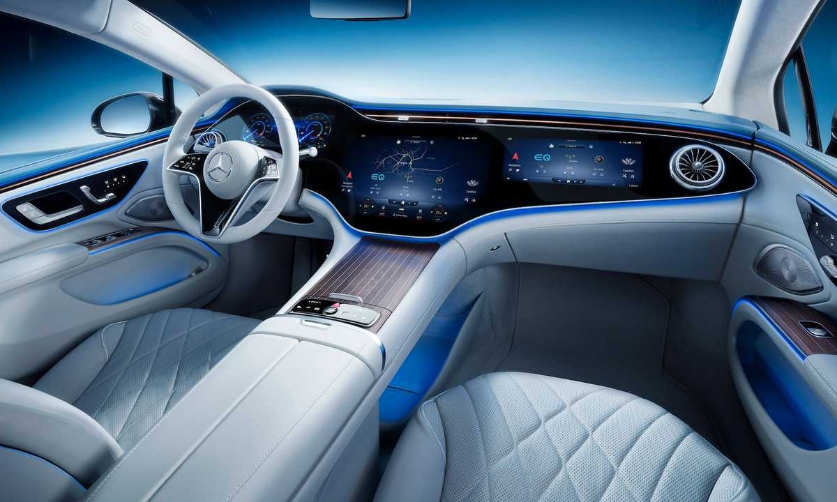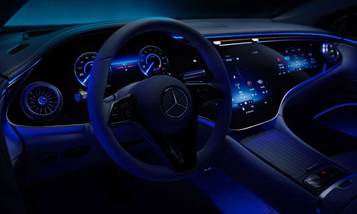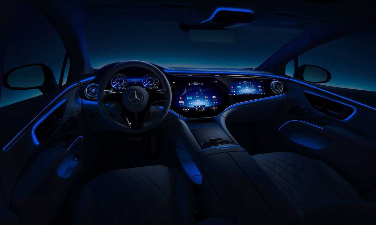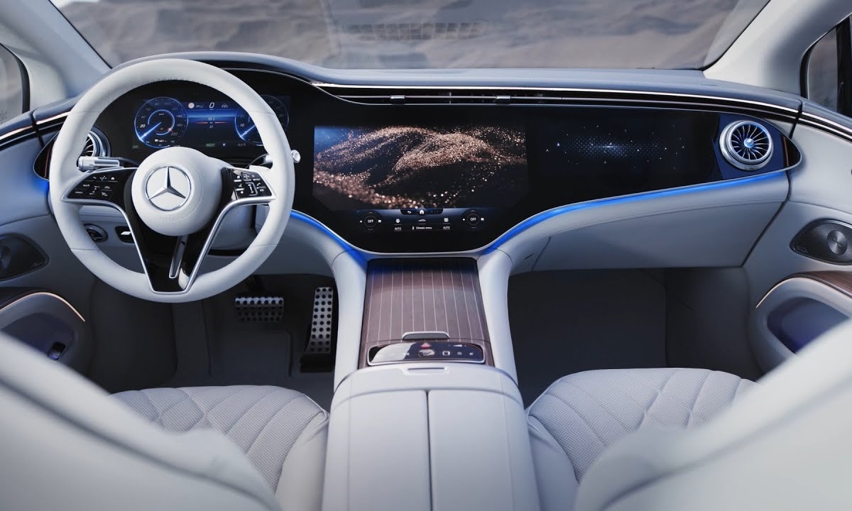 No total, o MBUX Hyperscreen mede 141 centímetros de ponta a ponta, com uma área utilizável pelos passageiros de 2.432,11 cm2. É apenas um dos elementos de destaque no interior do automóvel que se posiciona no mercado como uma espécie de Classe S dos elétricos.