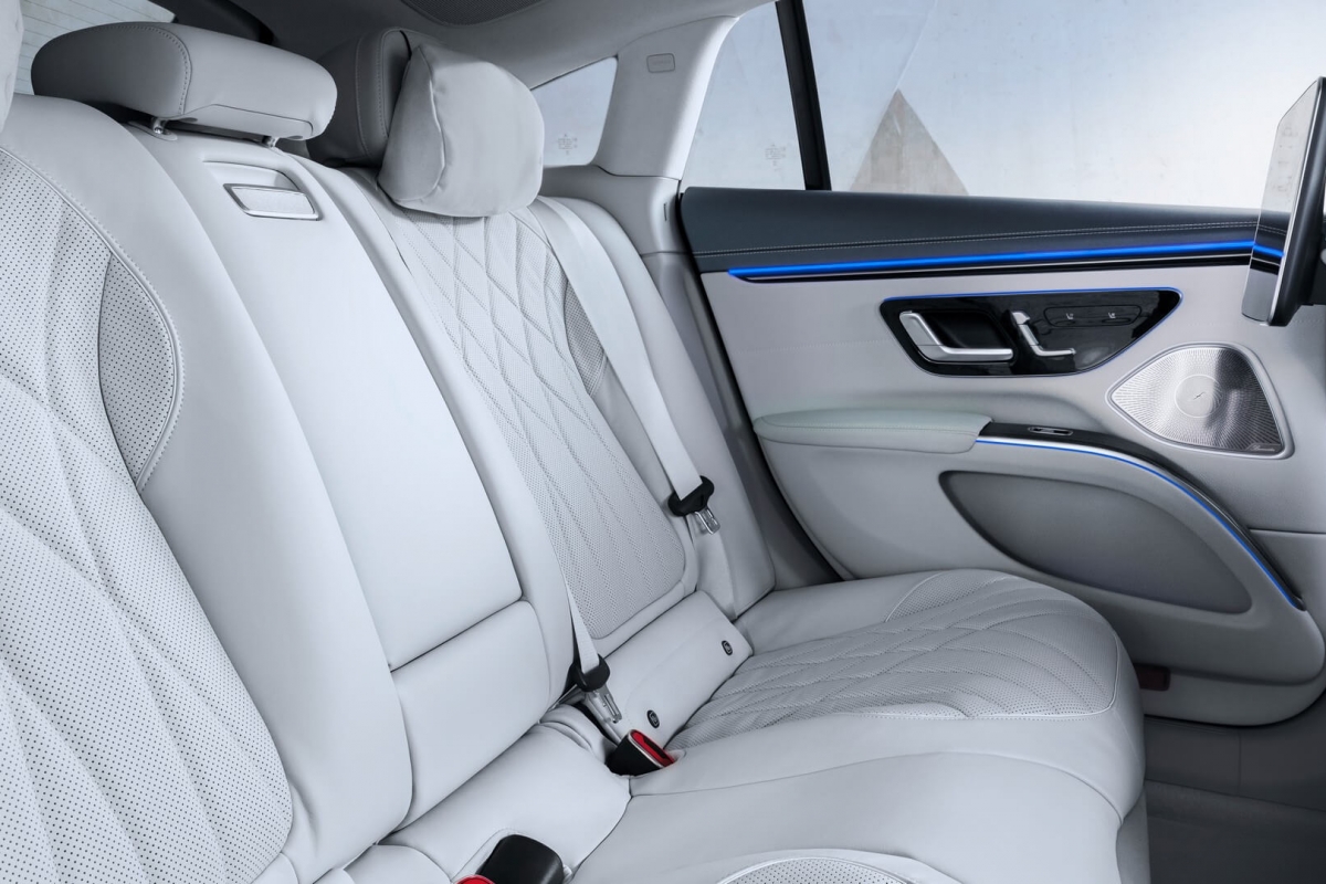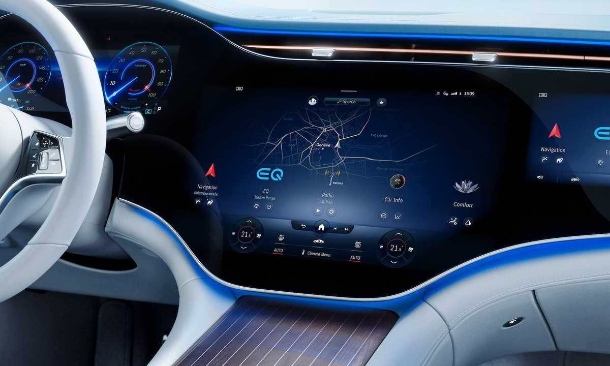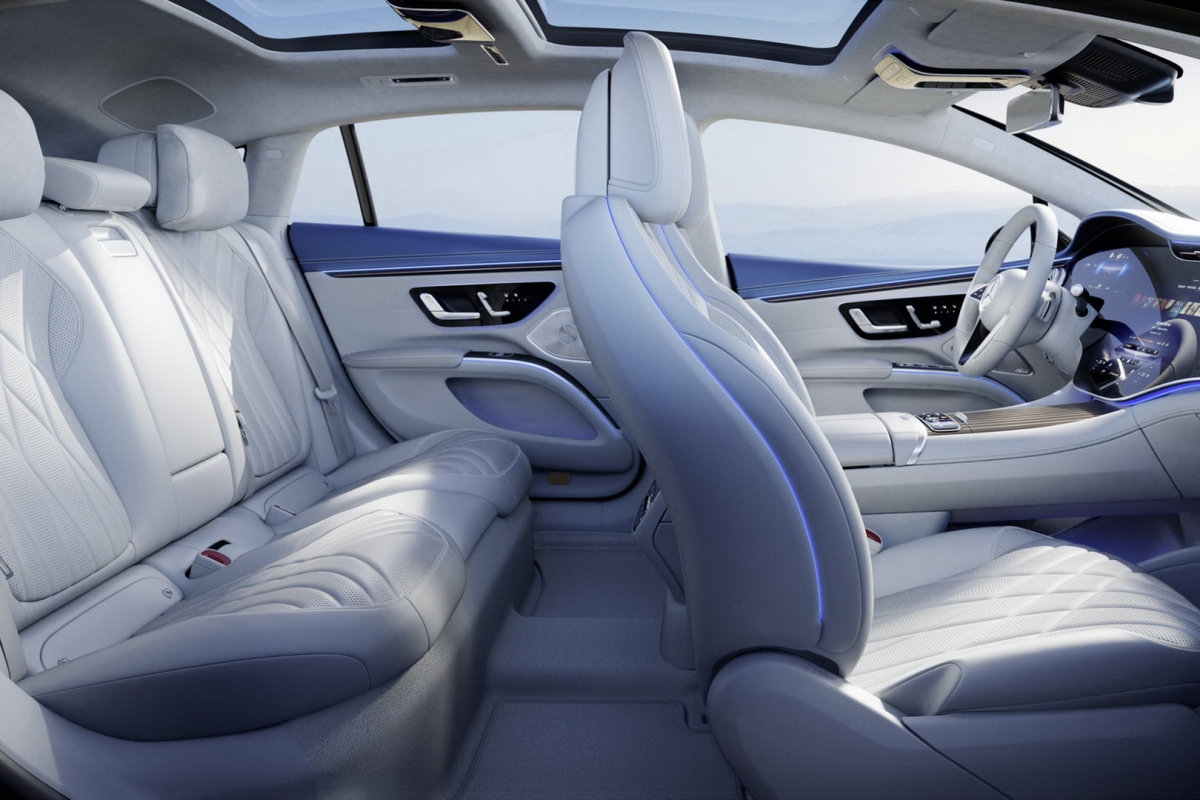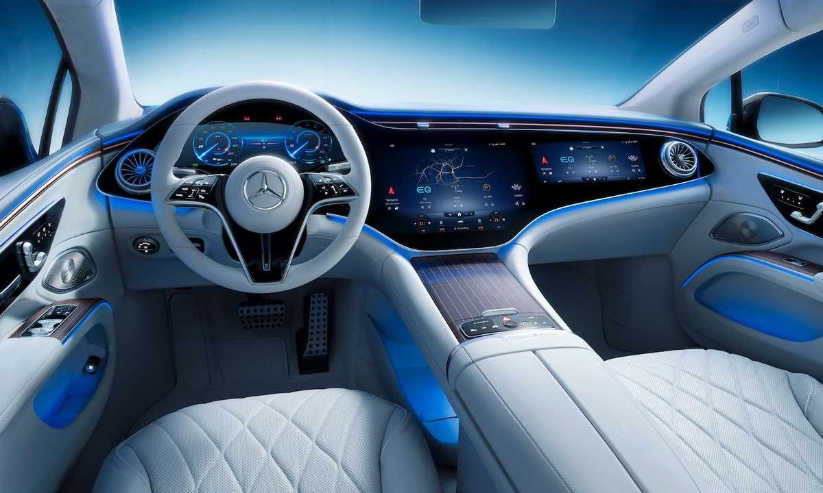 No total, o MBUX Hyperscreen mede 141 centímetros de ponta a ponta, com uma área utilizável pelos passageiros de 2.432,11 cm2. É apenas um dos elementos de destaque no interior do automóvel que se posiciona no mercado como uma espécie de Classe S dos elétricos.