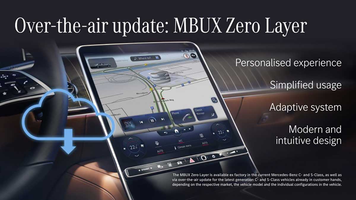 Os proprietários dos modelos Mercedes‑Benz Classe C (série 206; período de fabrico de junho de 2021) e Classe S (série 223 incluindo Maybach; período de fabrico de junho a novembro de 2021) podem agora utilizar a atualização remota para instalar a funcionalidade Camada Zero. Logo que a atualização de software esteja disponível para ser instalada, o cliente será notificado através do sistema de informação e de entretenimento MBUX e através da app Mercedes me.