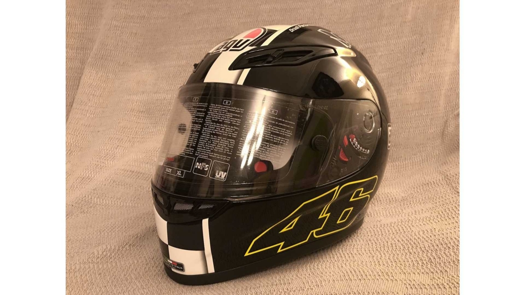 Trata-se de um exemplar do modelo AGV GP-Tech de edição limitada, comemorativa do oitavo título mundial de Rossi no MotoGP, que está a leilão na plataforma online da Iconic Motorbikes Auctions.