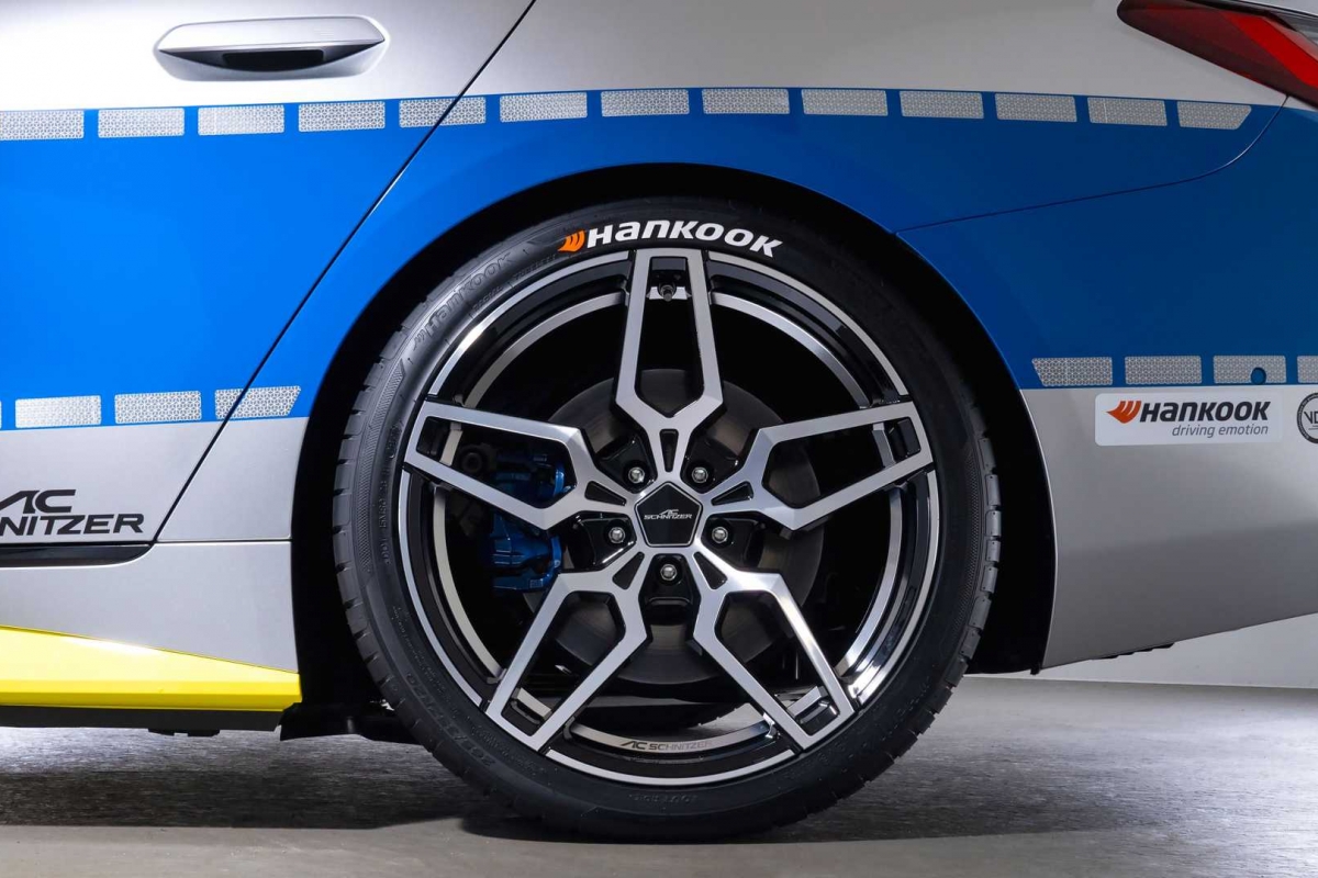O BMW i4 da AC Schnitzer está rebaixado em 25 mm face ao modelo de série e monta jantes AC4 Flow Forming de 20 polegadas com acabamento BiColor prata/preto com pneus Hankook Ventus S1 Evo 3.