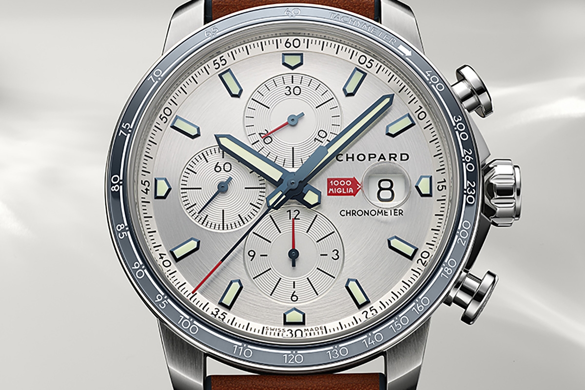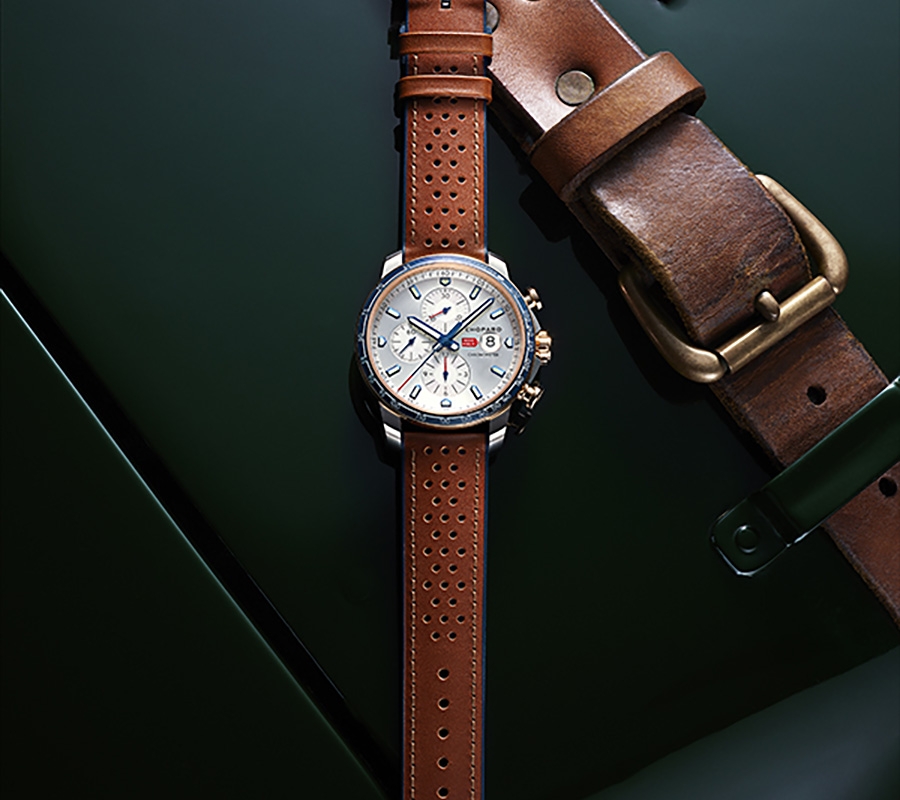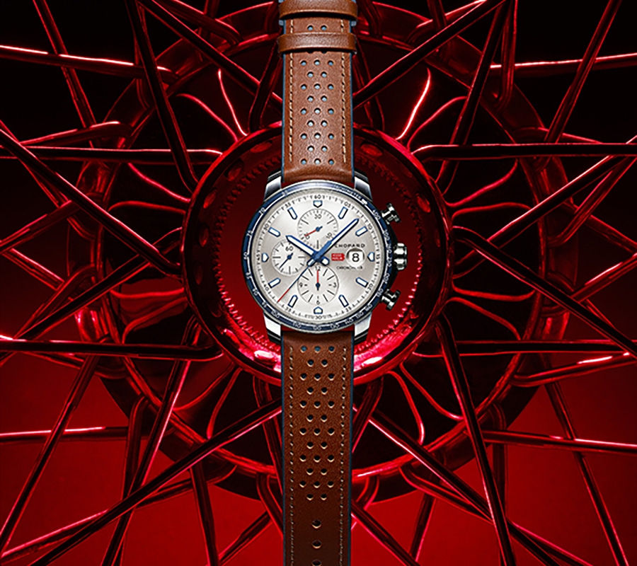 A emblemática colecção de relógios da Chopard aparece vestida de cinza e azul de forma a homenagear uma das mais prestigiada corridas de clássicos ,de estrada aberta. Os novos relógios de 44mm, em ouro rosa, com 18 quilates com versões disponíveis em aço inoxidável ou totalmente em aço.