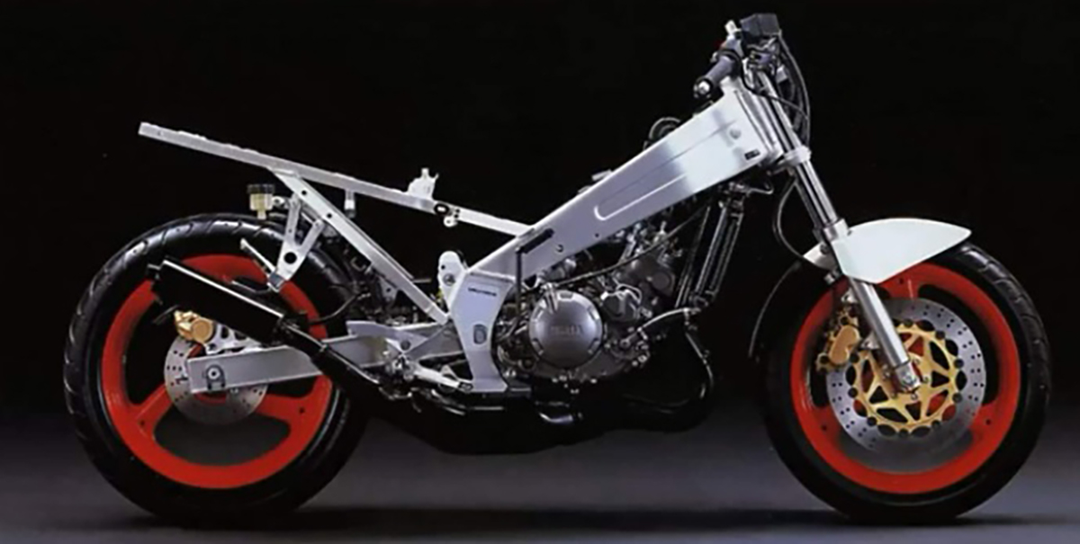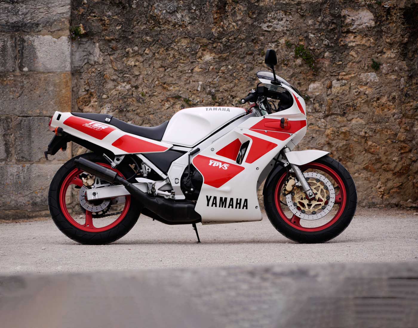 Um magnífico quadro do tipo deltabox, uma motorização com 2 cilindros em linha, refrigeração líquida, uma agradável caixa de 6 velocidades e capaz de nos oferecer cerca de 45 cv (foram variando ao longo das versões) e 140 kg em ordem de marcha. Já vinha com ignição por cdi, mas ainda mantinha um sistema de arranque por pedal (vulgo kick) e as válvulas de escape YPVS tinham parte da responsabilidade da resposta do motor ser vigorosa ali a partir das 6.000, chegando às 10.000 num instante, altura em que toda a cavalagem fica disponível.