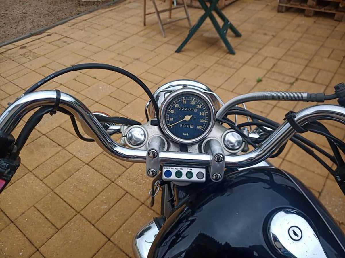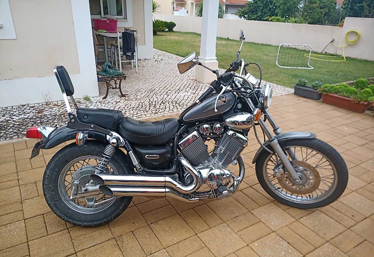 Sobre esta Virago, salta à vista o razoável estado geral, nomeadamente na pintura e cromados. Há aqui e acolá umas marcas de ferrugem mais ou menos superficial, alguns parafusos oxidados, a tampa lateral direita que foi “remendada” (talvez resultado de uma queda), falta um pedaço do guarda-lamas traseiro, mas nada desses pormenores acabam por retirar o charme a esta bonita Virago, sendo que a sua baixa quilometragem é algo que salta à vista: pouco mais de 22.000 km’s e que são reais! Algo como uns míseros 850 km/ano! Espero que o atual proprietário altere isso! A moto merece!