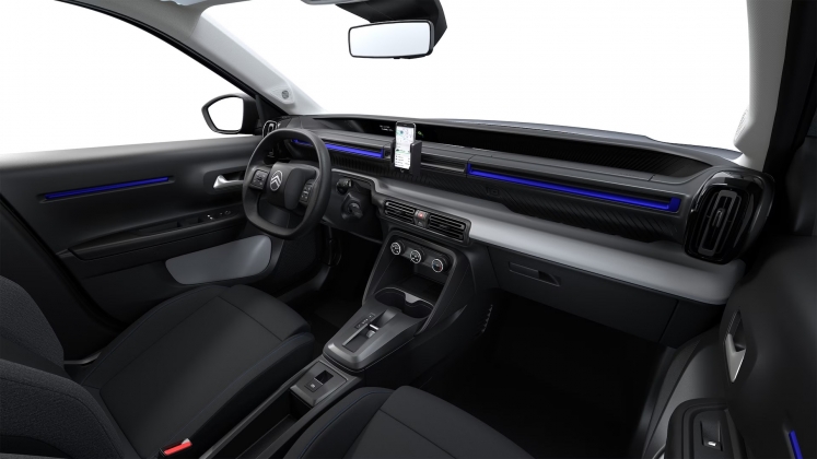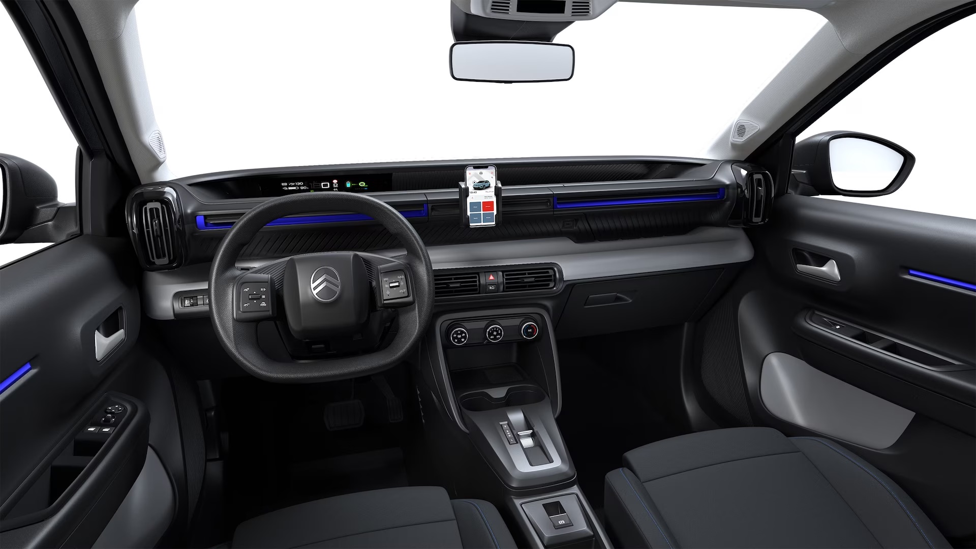 Ao centro do tabliê em baixo encontramos controlos físicos para a climatização, e mais acima está um ecrã tátil de 10,25 polegadas que serve exclusivamente para o infoentretenimento. Para além da compatibilidade com Android Auto e Apple Carplay tem a aplicação dedicada MyCitroën. Esta aplicação, permite não só pré-aquecer ou pré-arrefecer o veículo antes da partida, como gerir os horários de carregamento, monitorizar o estado da carga e mostrar a localização do veículo.