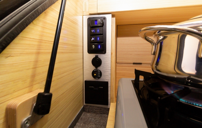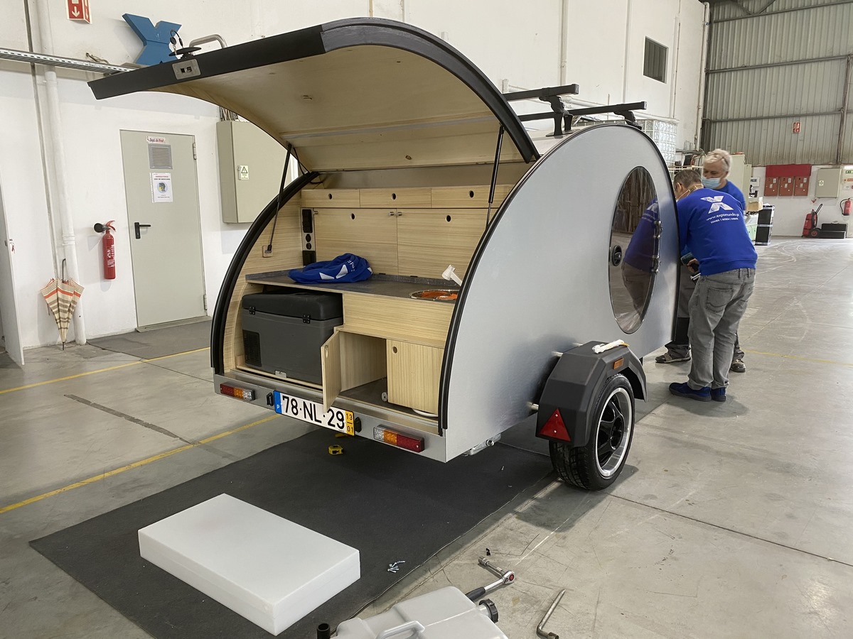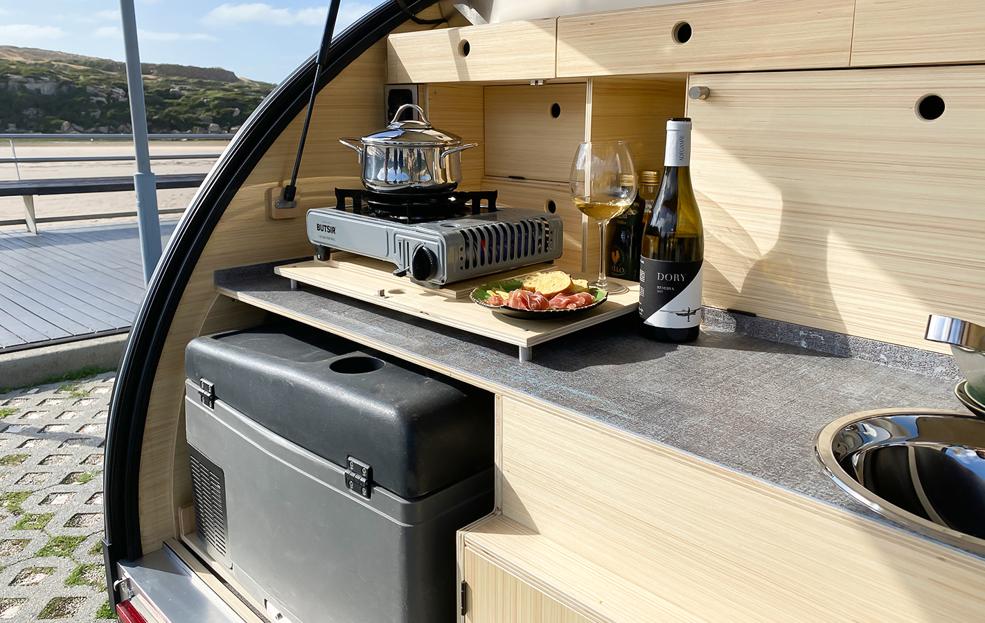 Além da cama de casal, com 195 centímetros por 140 centímetros, a minicaravana em forma de lágrima vem equipada com uma cozinha exterior (sem fogão) e uma estrutura adicional no teto, que pode servir para o transporte de objetos como pranchas de surf ou outros e onde pode montar-se uma tenda.