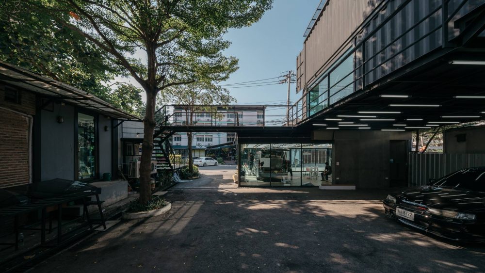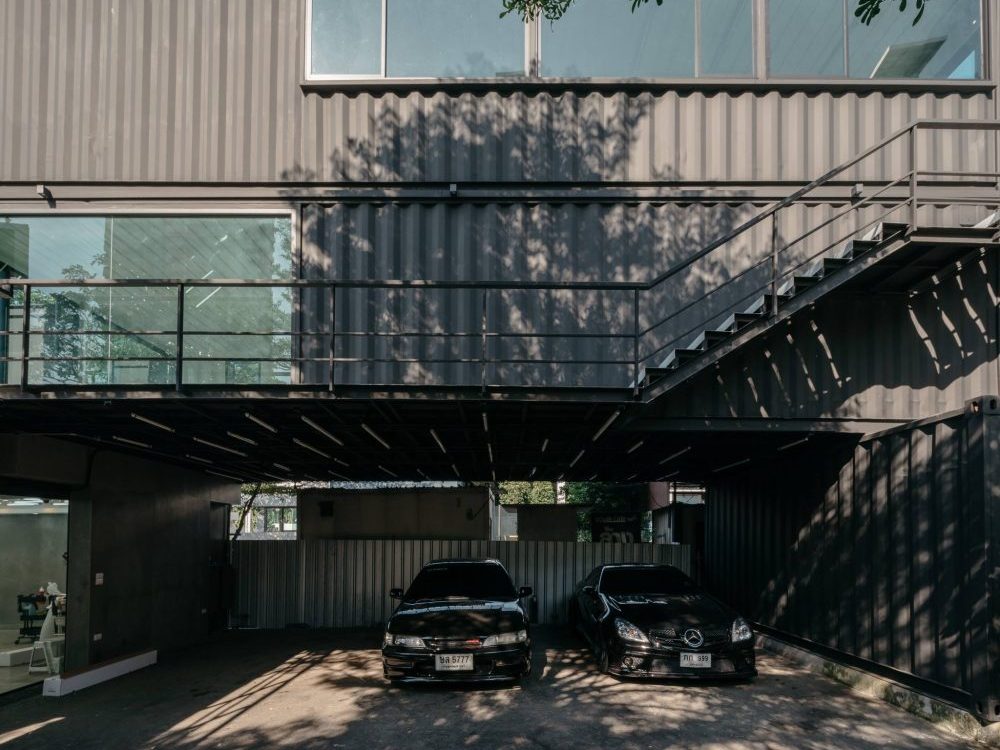 O rés-do-chão é usado para guardar os automóveis (os portões dos contentores foram mantidos, e servem para trancar as portas de vidro) e para a área de pintura, que necessitou de um tratamento especial para evitar contacto com o ar e tirar todo o partido do espaço reduzido. O primeiro andar está preparado para um restaurante e bar para servir os clientes do espaço, e o escritório está montado no segundo andar. Há também espaço para uma zona residencial para empregados. O exterior dos contentores foi pintado de preto para não atrair a atenção (os clientes agradecem), enquanto o interior é branco para aumentar a sensação de espaço, reforçado por 131 lâmpadas fluorescentes.