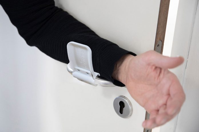 Trata-se de um sistema simples, mas engenhoso, pensado para reduzir o risco de infeção por coronavírus, evitando o contacto das mãos com superfícies que representam um elevado risco de contágio. Uma vez instalado na maçaneta de uma porta, este dispositivo permite abri-la apenas com o braço.