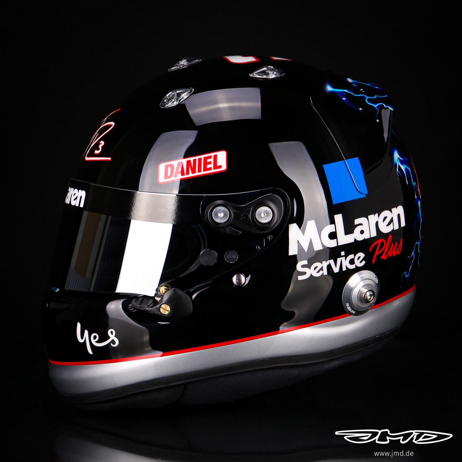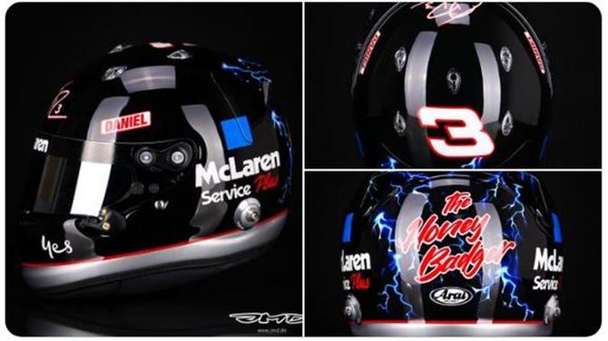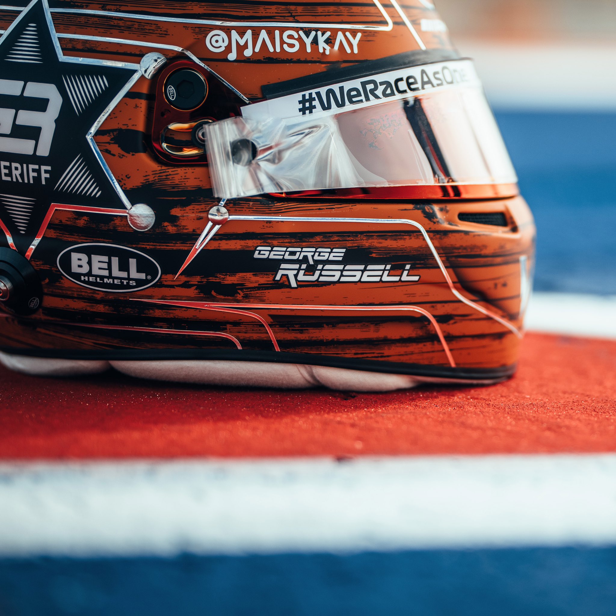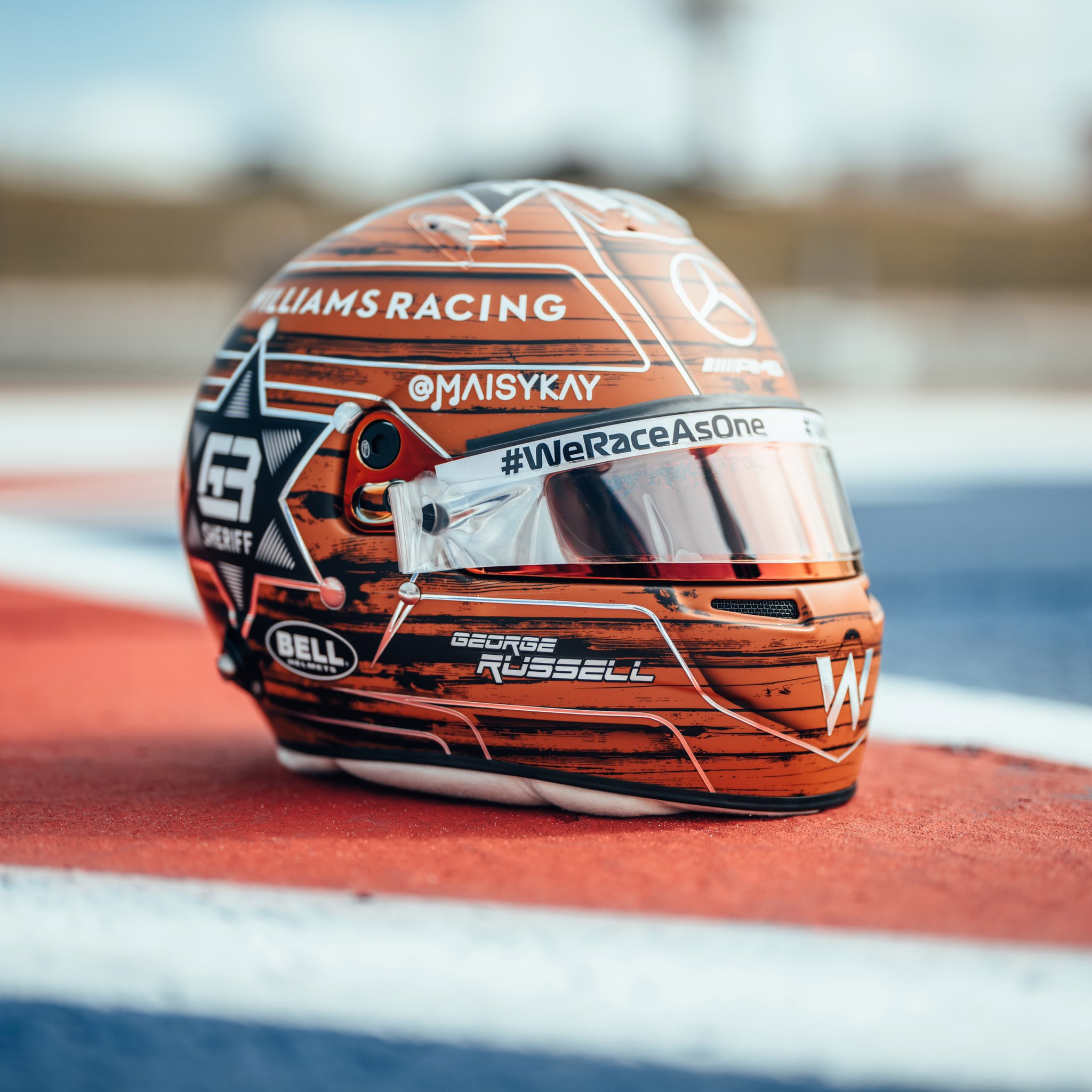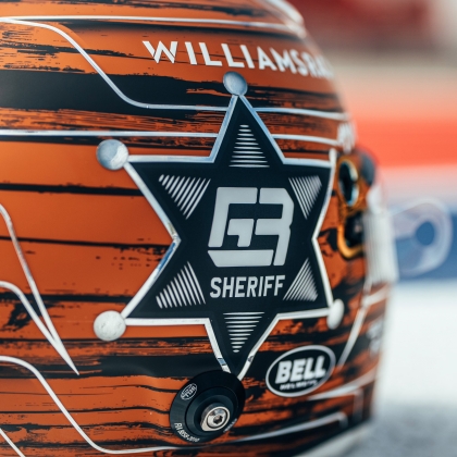 Daniel Ricciardo, piloto McLaren, presta homenagem ao ídolo Dale Earnhardt Sr, campeão da NASCAR, enquanto George Russell (Williams) usa os símbolos dos xerifes texanos do Velho Oeste.