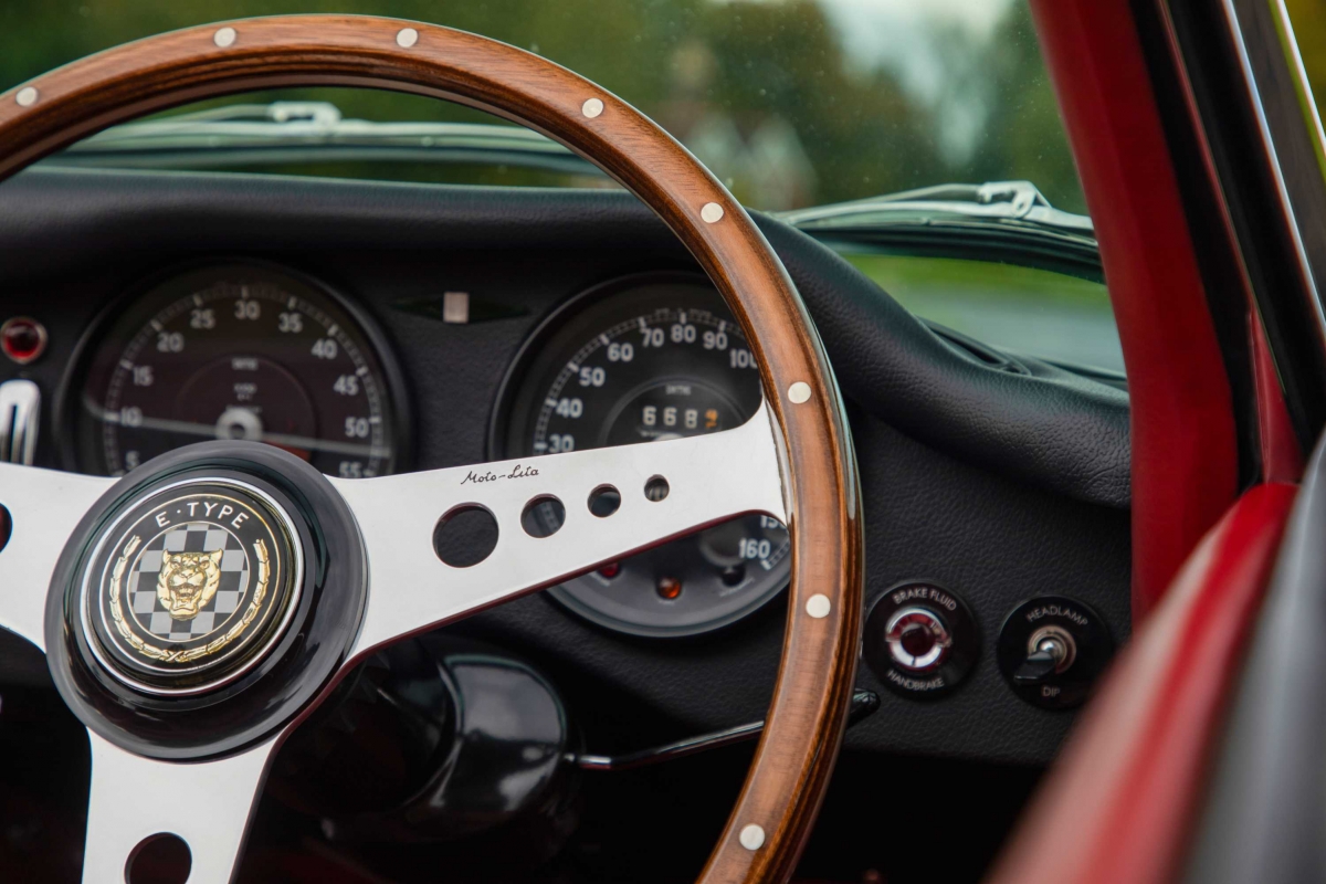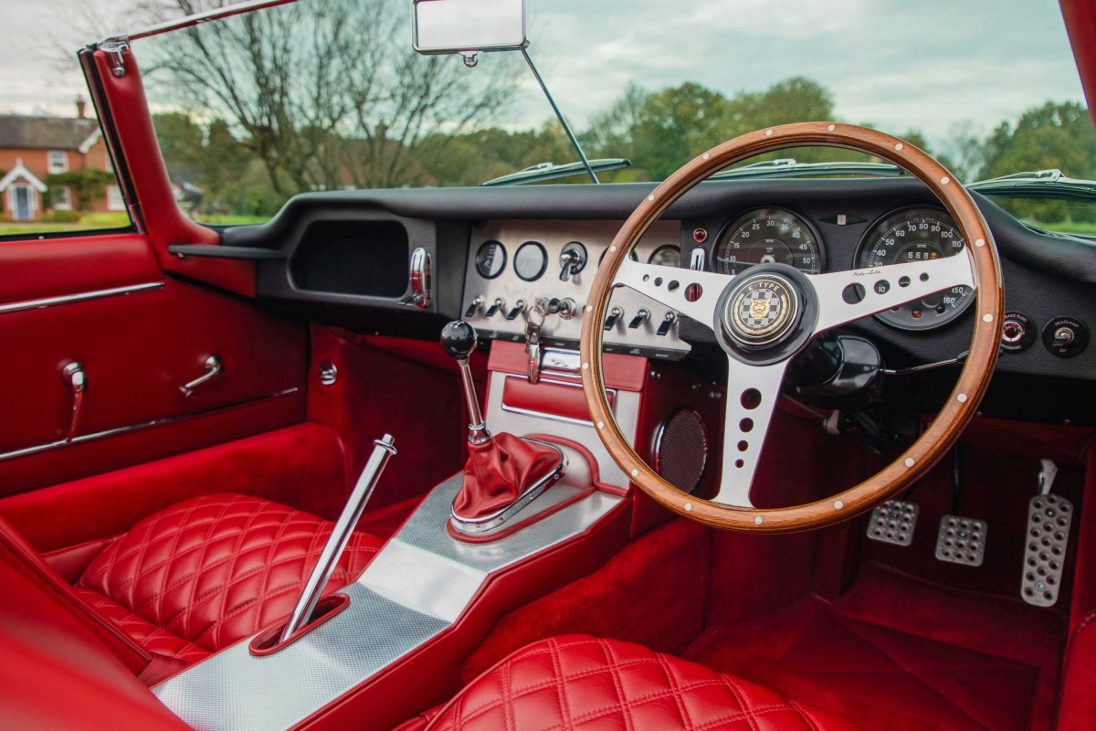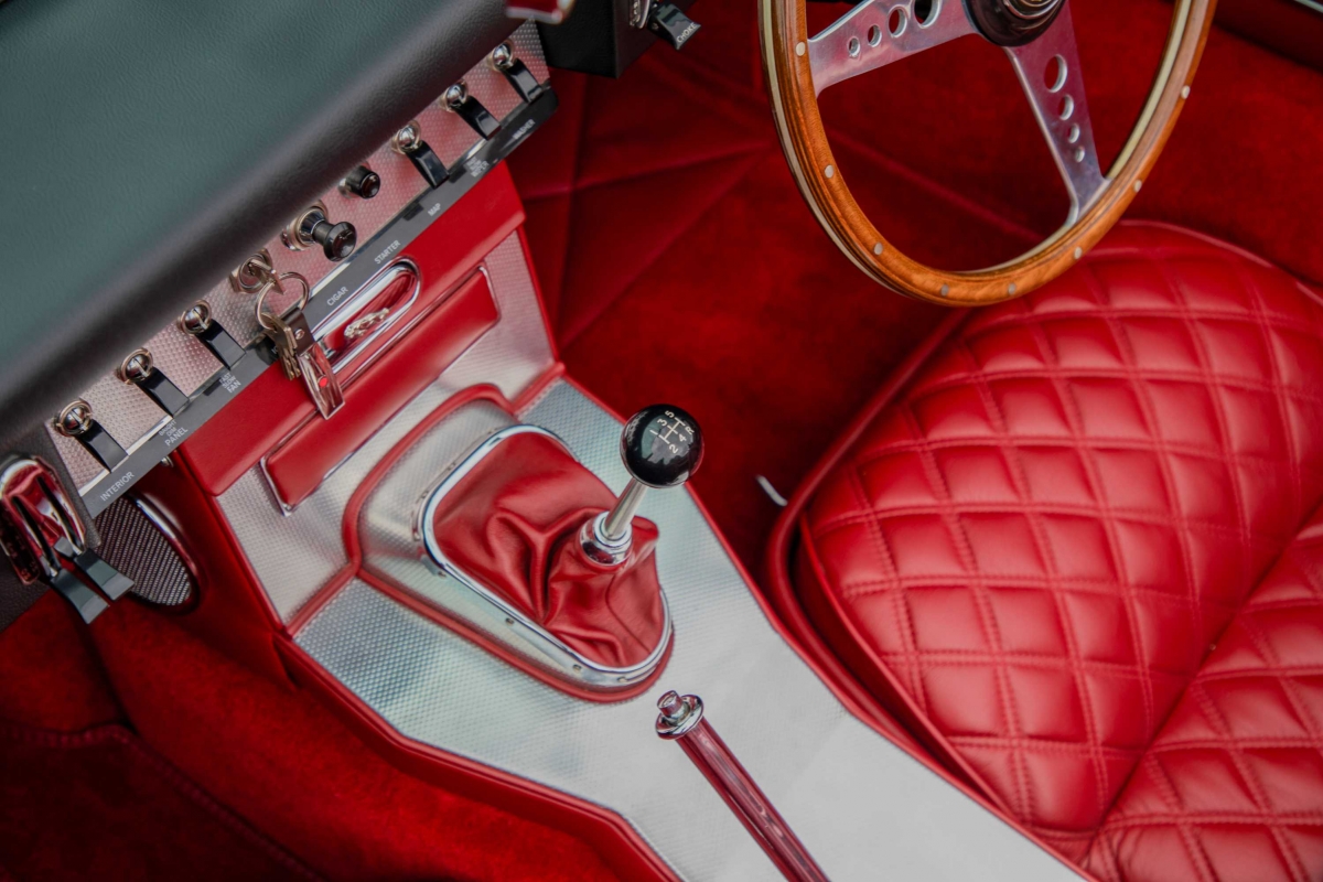 A mesma atenção ao detalhe foi dada ao interior, com a equipa do E-Type UK a criar um habitáculo personalizado e totalmente transformado. Para concretizar a visão do cliente, foi aplicado um acabamento personalizado aos bancos, soleiras e tapetes – que estão agora adornados com pele vermelha acolchoada com diamantes. A isto junta-se uma consola central e um painel de instrumentos em alumínio, reluzentes e corretos para a época, onde se encontra a icónica linha original de instrumentos Smiths.
