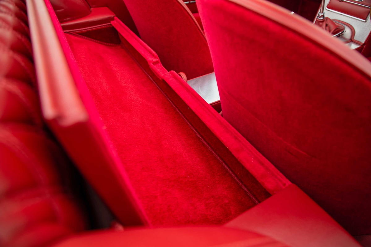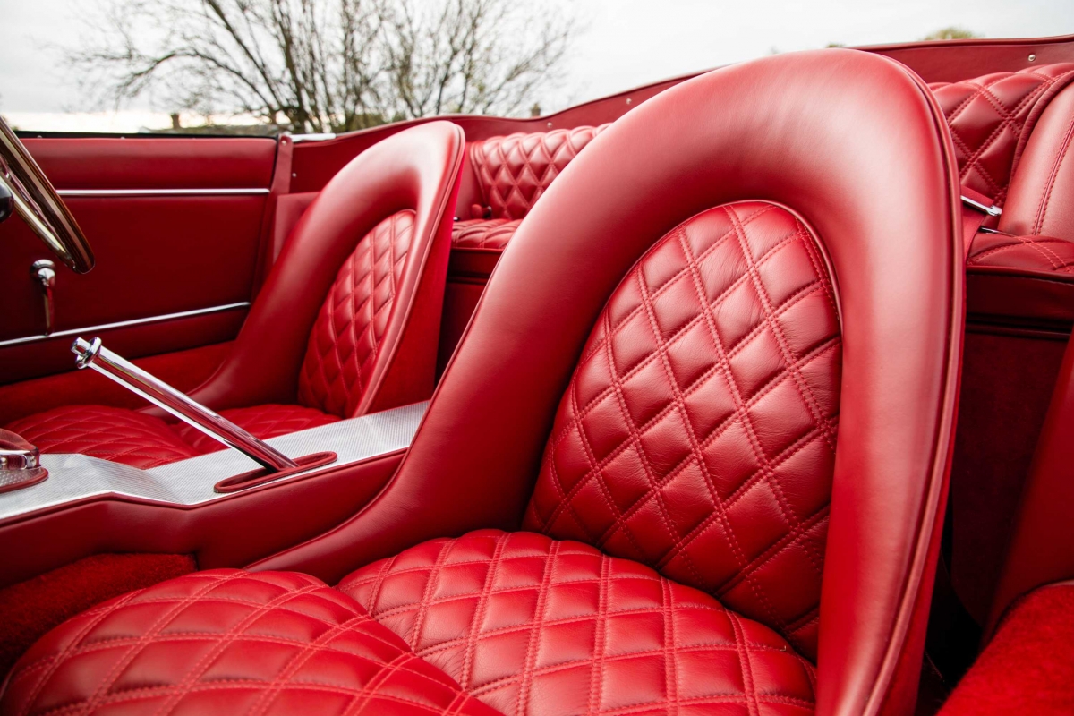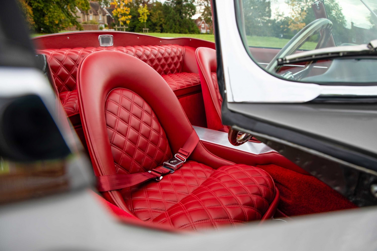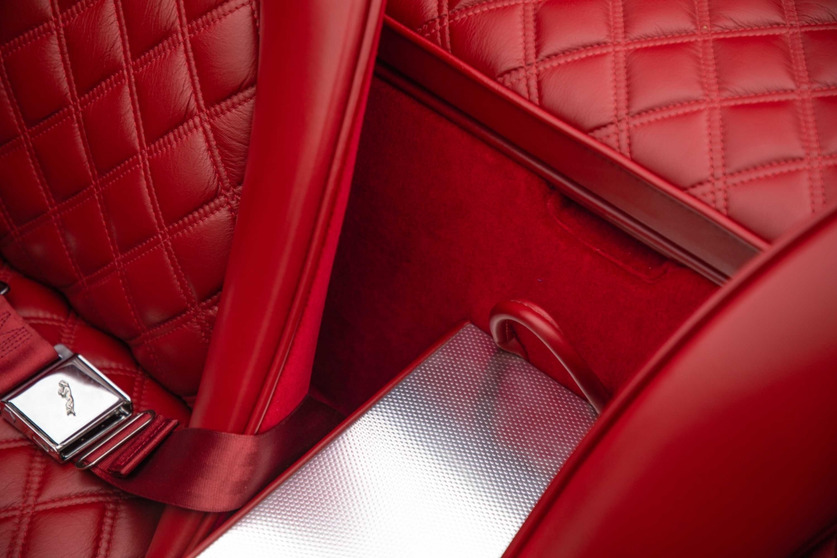 A mesma atenção ao detalhe foi dada ao interior, com a equipa do E-Type UK a criar um habitáculo personalizado e totalmente transformado. Para concretizar a visão do cliente, foi aplicado um acabamento personalizado aos bancos, soleiras e tapetes – que estão agora adornados com pele vermelha acolchoada com diamantes. A isto junta-se uma consola central e um painel de instrumentos em alumínio, reluzentes e corretos para a época, onde se encontra a icónica linha original de instrumentos Smiths.