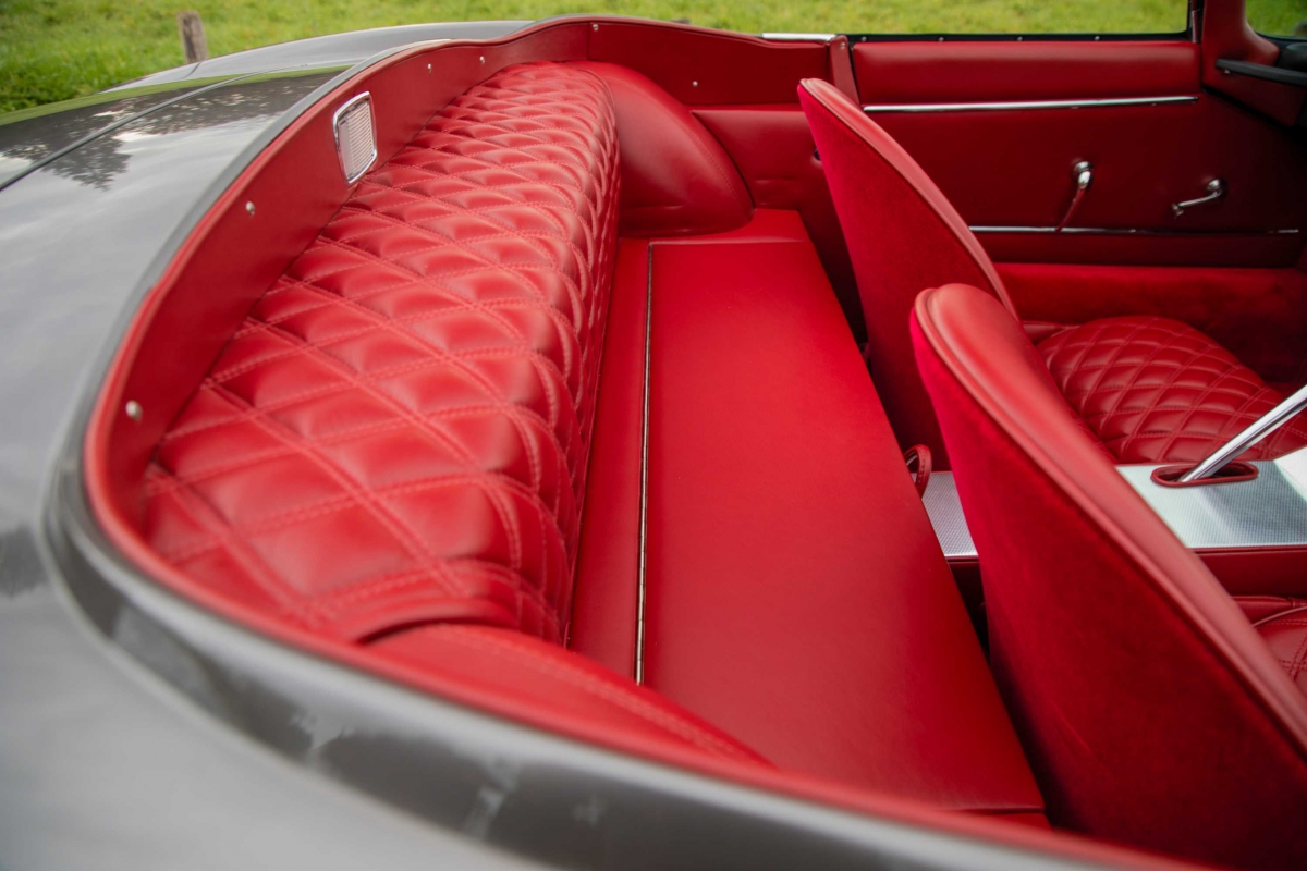 A equipa também fabricou uma área de arrumação à medida na antepara traseira, aproveitando este espaço, que agora está elegantemente revestido em pele e padrão a condizer. Este espaço de arrumação personalizado também funciona como uma área de assento útil para os amigos peludos, assegurando que os animais de estimação queridos da família podem acompanhar o carro. A E-Type UK forneceu uma secção almofadada amovível para maior conforto dos animais de estimação.