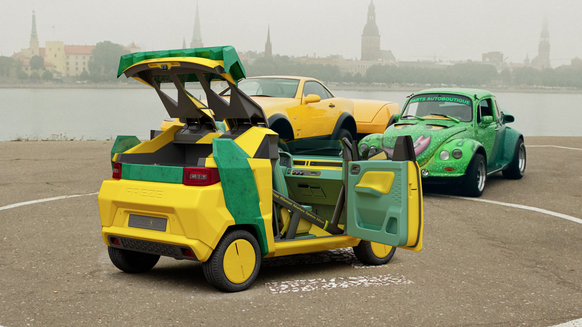 O elétrico mede só 2,92 metros de comprimento e tem o nome inspirado no Volkswagen Froggy, um Volkswagen Beetle que Leonard Yankelovich (diretor de Dartz Freze) preparou em 1993.