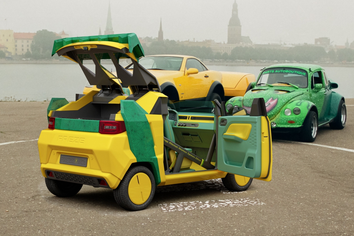 O elétrico mede só 2,92 metros de comprimento e tem o nome inspirado no Volkswagen Froggy, um Volkswagen Beetle que Leonard Yankelovich (diretor de Dartz Freze) preparou em 1993.