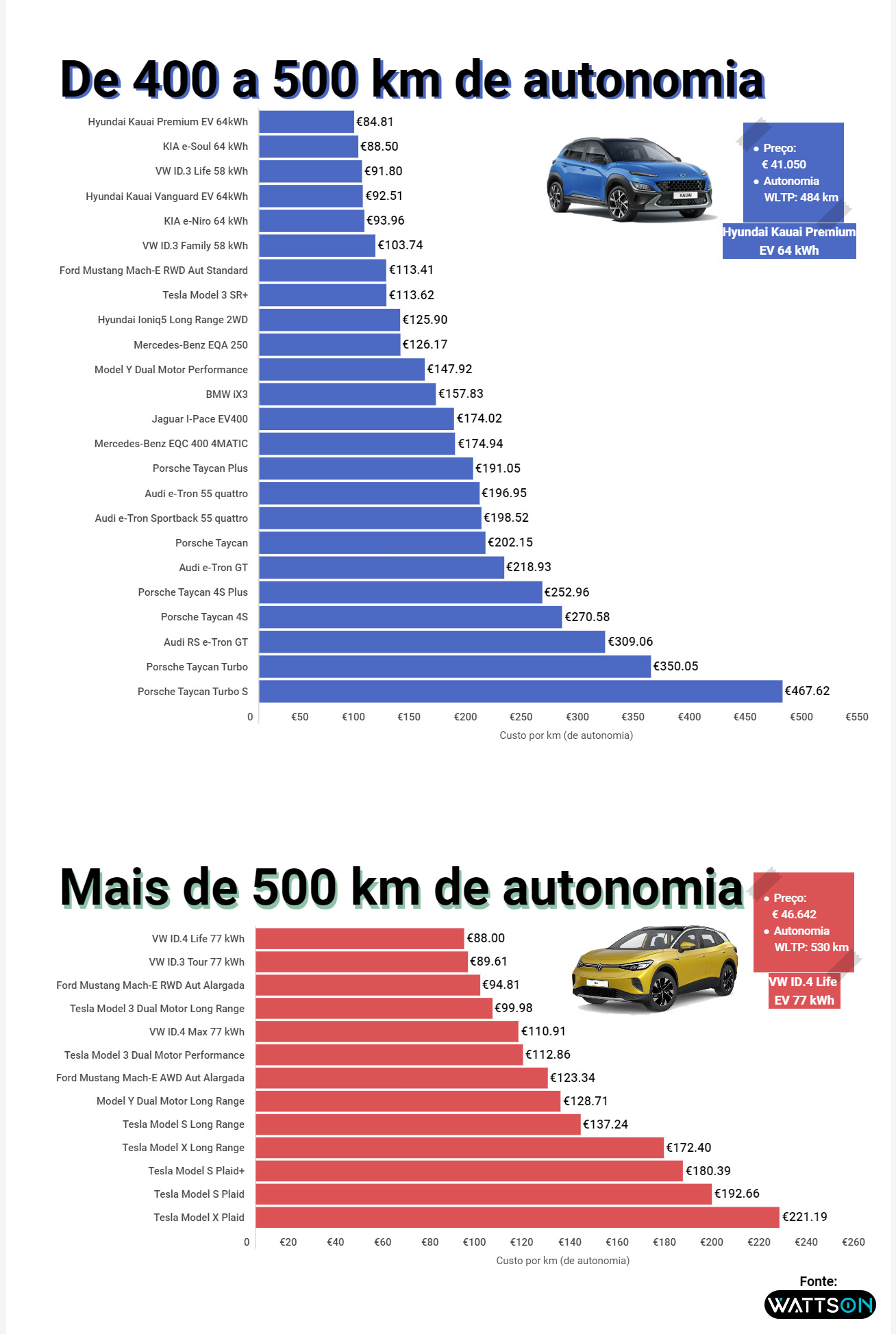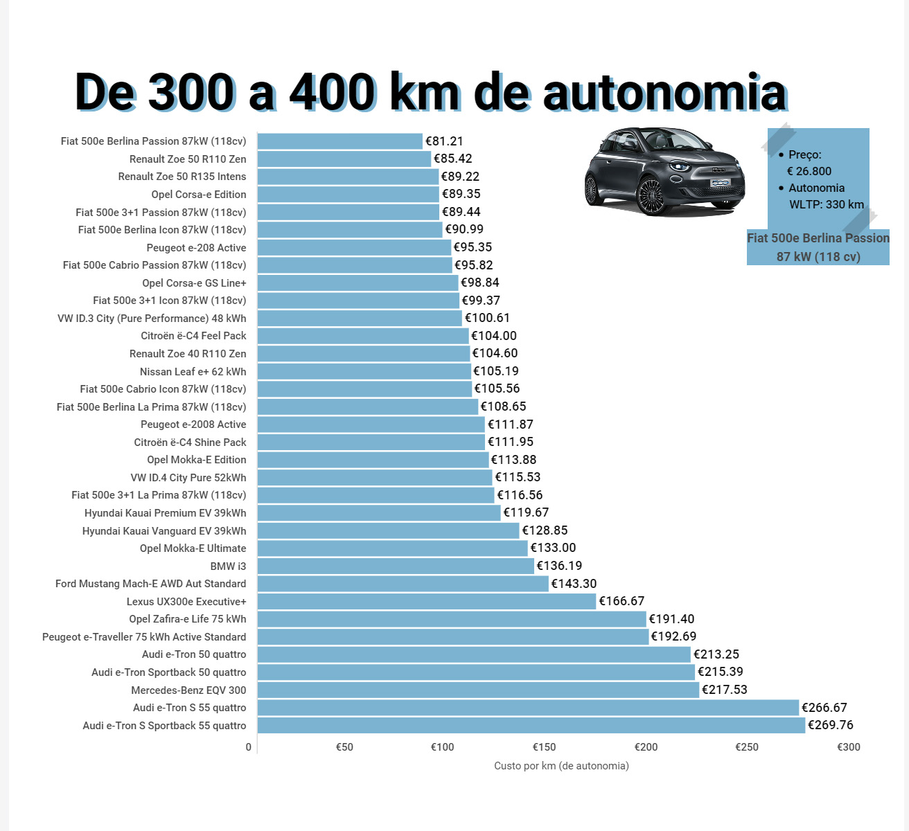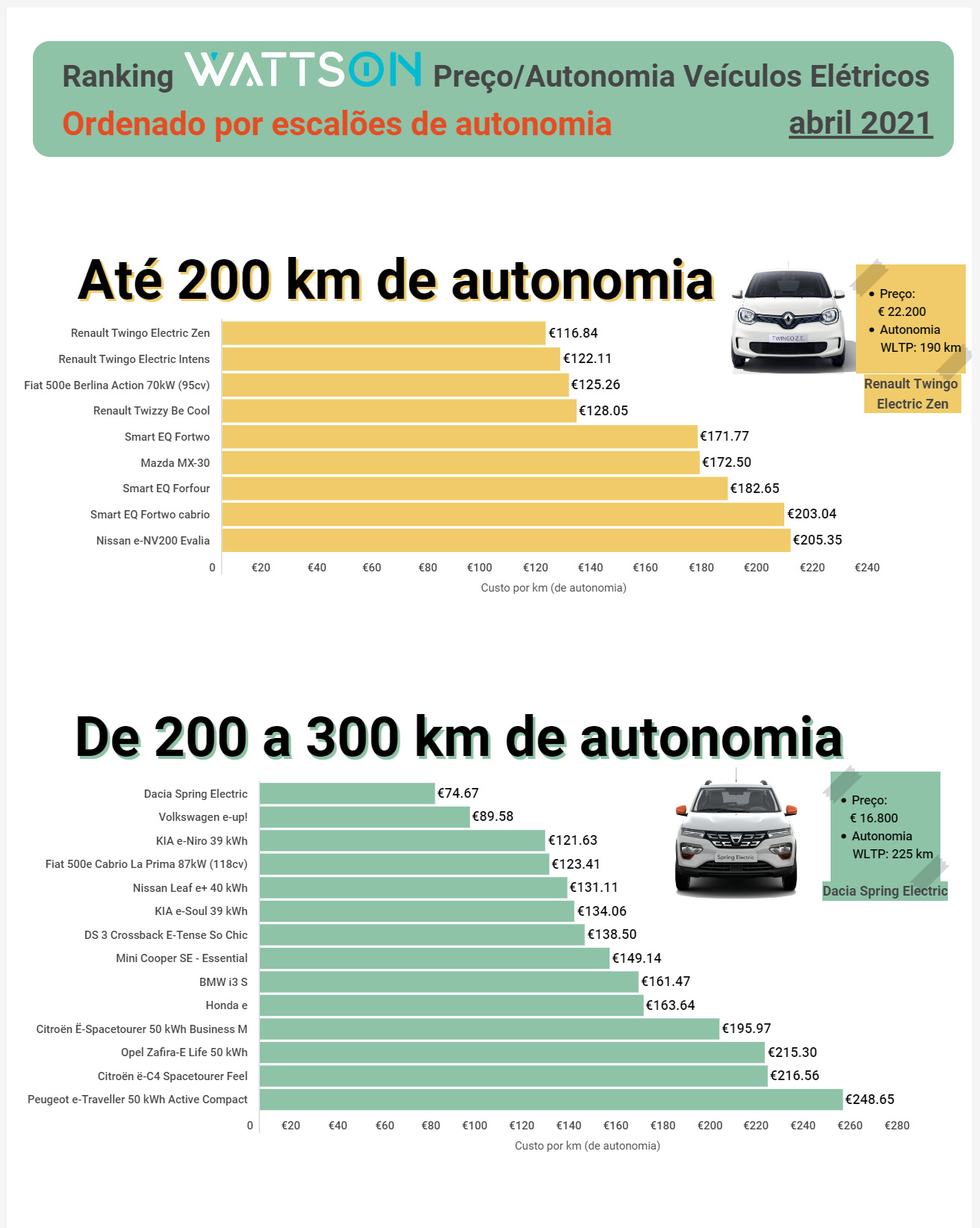 Nesta hierarquia de eficiência, os campeões em cada um destes mencionados escalões de autonomia são: Renault Twingo Electric Zen (até 200 km de alcance); Dacia Spring Electric (de 200 km a 300 km de autonomia); Fiat 500e Berlina Passion (de 300 km a 400 km de autonomia); Hyundai Kauai Premium EV 64 kWh (de 400 km a 500 km de autonomia); e VW ID.4 Life 77 kWh (mais de 500 km de autonomia).
