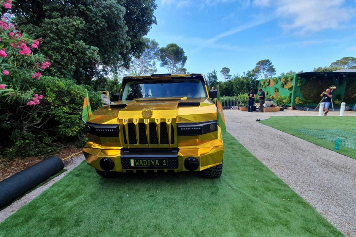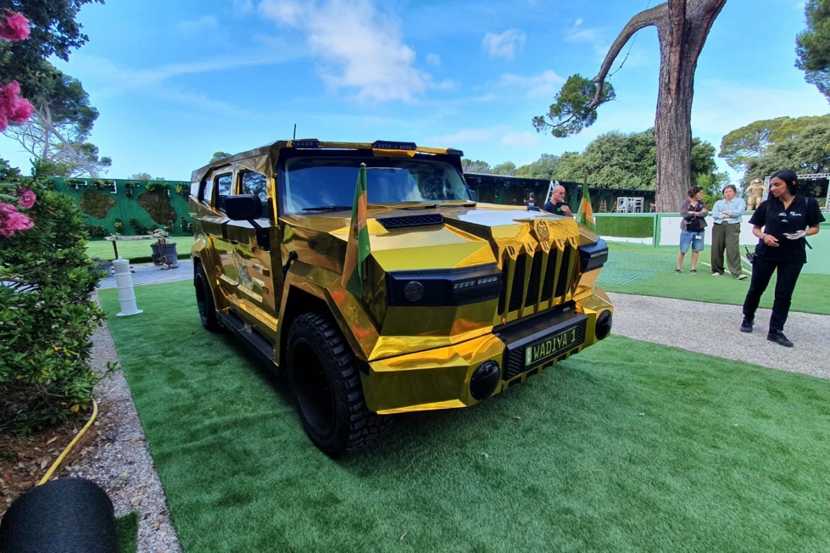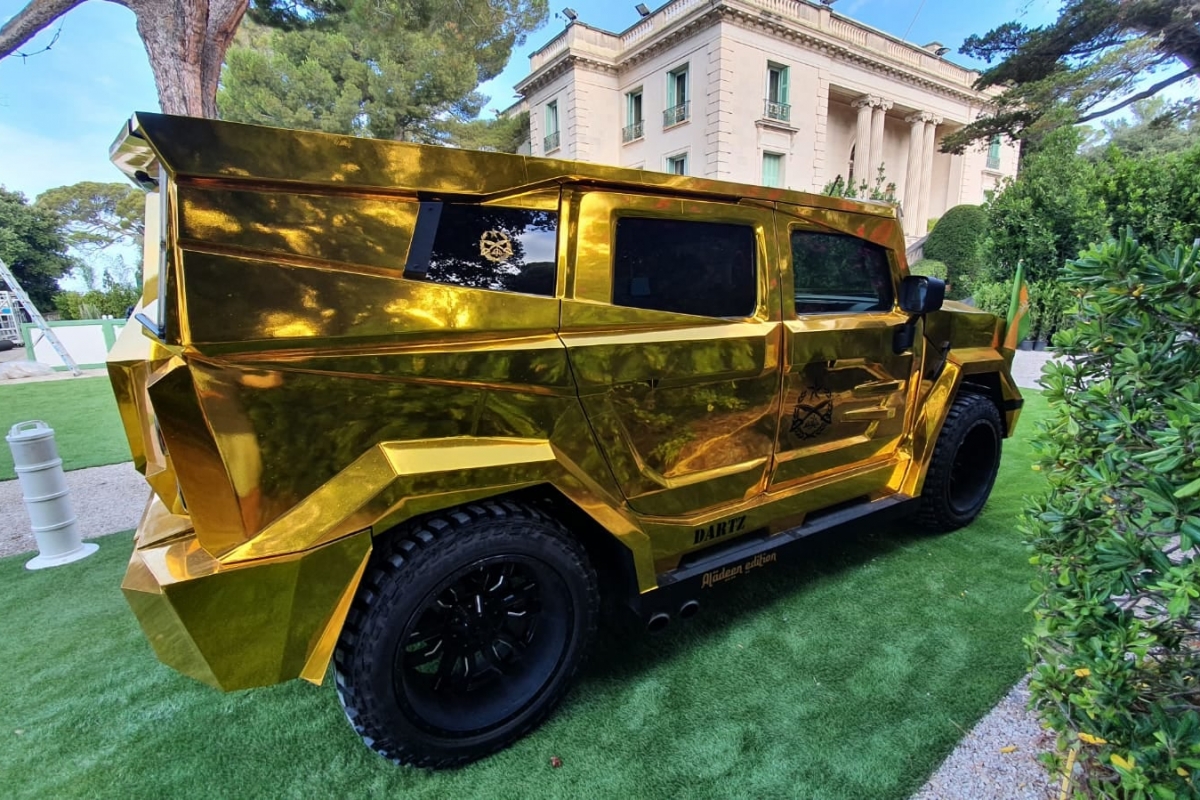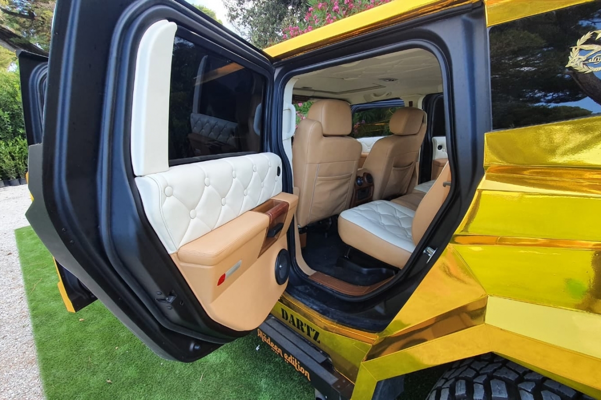 O modelo nas imagens é o último de 10 exemplares à venda da edição especial Aladeen, construído a partir da base técnica do Hummer H2, com acabamentos em ouro, blindagem especial e um motor V8 de 405 cv.
