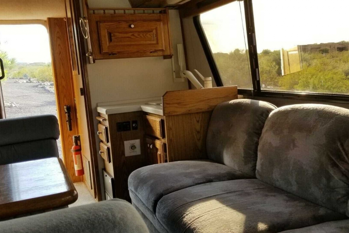 A autocaravana Chinook utiliza a base rolante de um Ford E-350 e o motor Triton V10 da marca da oval azul. No interior, todas as comodidades necessárias aos dias de evasão: quatro, sala de estar com sofá, cozinha equipada e duche com água quente.
