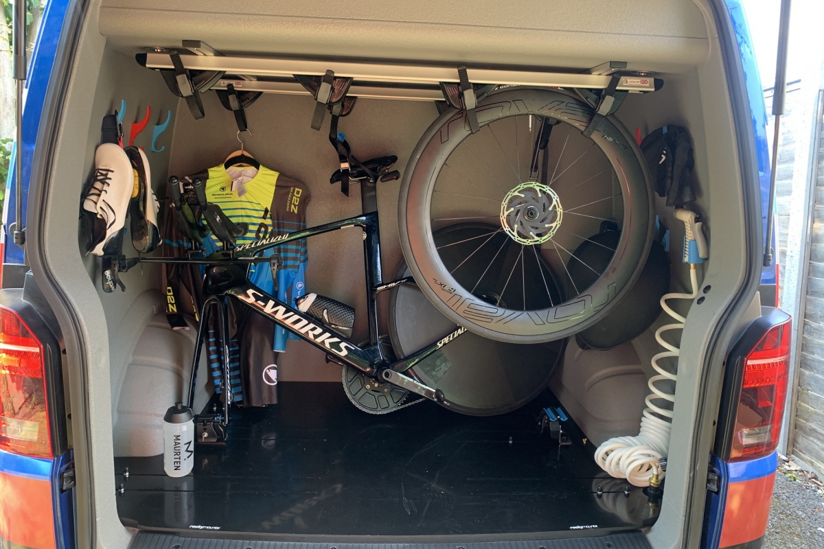 Cama, cozinha e cafetaria, com espaço para arrumar até cinco bicicletas, eis a versão do Volkswagen Transporter para ciclistas profissionais.