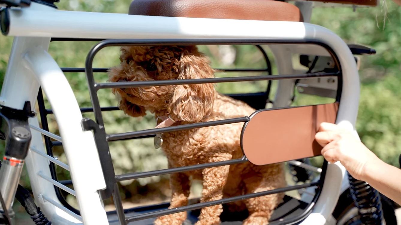 O companheiro de quatro patas viaja no compartimento ao centro da scooter elétrica, arejado e bem protegido pela própria estrutura do quadro, com uma porta lateral.
