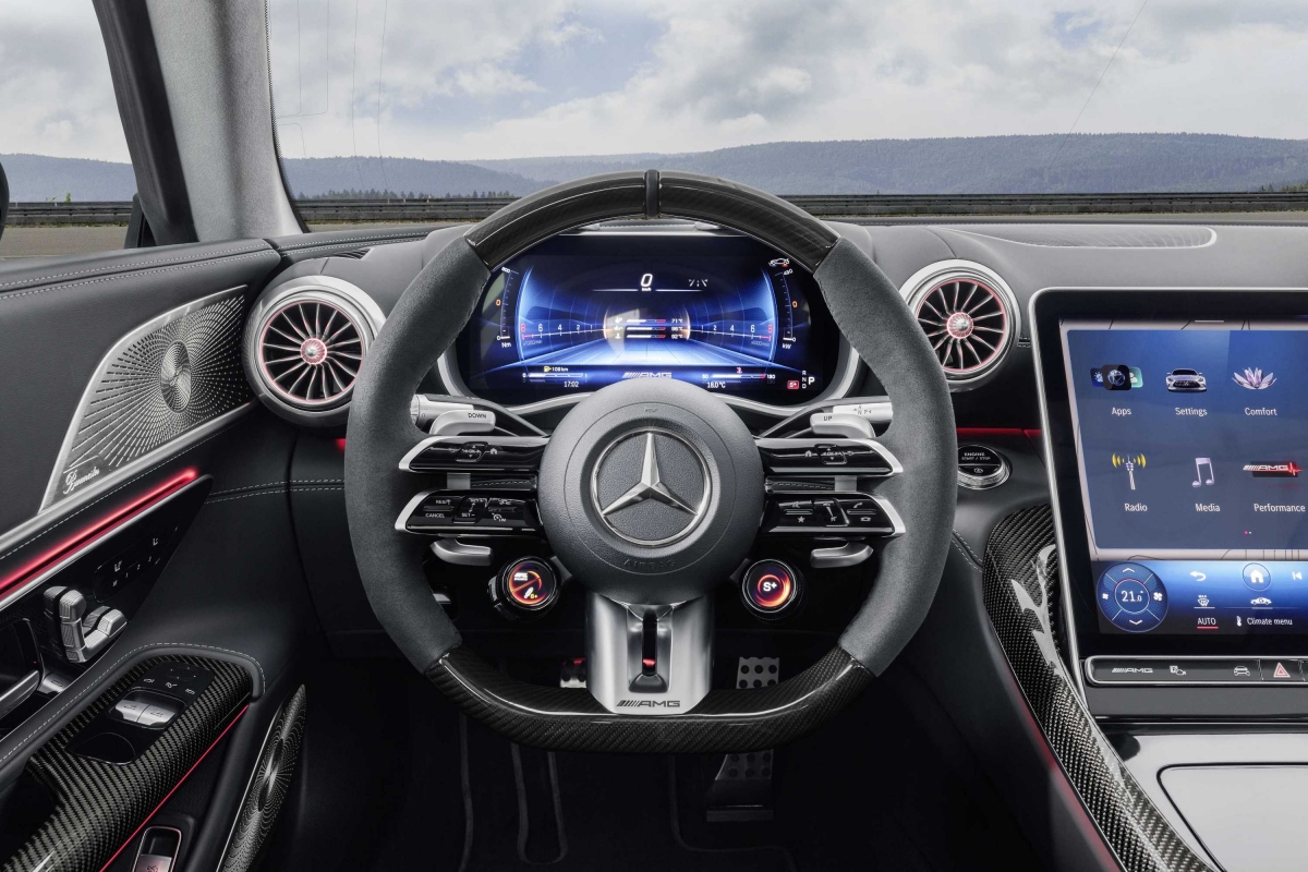 Para além do modo “Race”, existem ainda mais cinco: “Slippery”, “Comfort”, “Sport”, “Sport +” e “Individual”, que mudam as características de comportamento dinâmico do veículo e podem ser selecionadas no sistema de informação e entretenimento, ou num botão no volante. Para os fãs de track days, o AMG GT Coupé vem equipado de série com o AMG Track Pace – um auxiliar de condução em pista –, que para além de memorizar o seu traçado no sistema também pode ser apresentado no ecrã do sistema multimédia com função de realidade aumentada do MBUX. Isto permite ao condutor melhorar o seu estilo de condução com um instrutor virtual. Regista mais de 80 dados específicos do veículo como: velocidade, aceleração, ângulo da direção, acionamento do pedal dos travões, dez vezes por segundo. O menu ‘Telemetria’ pode apresentar 40 parâmetros em tempo real. É possível também visualizar os tempos por volta e por setor no ecrã multimédia, no head-up display e no painel de instrumentos. O sistema de navegação no head-up display mostra os ângulos de viragem e os pontos de travagem para ajudar o condutor a encontrar a melhor trajetória.